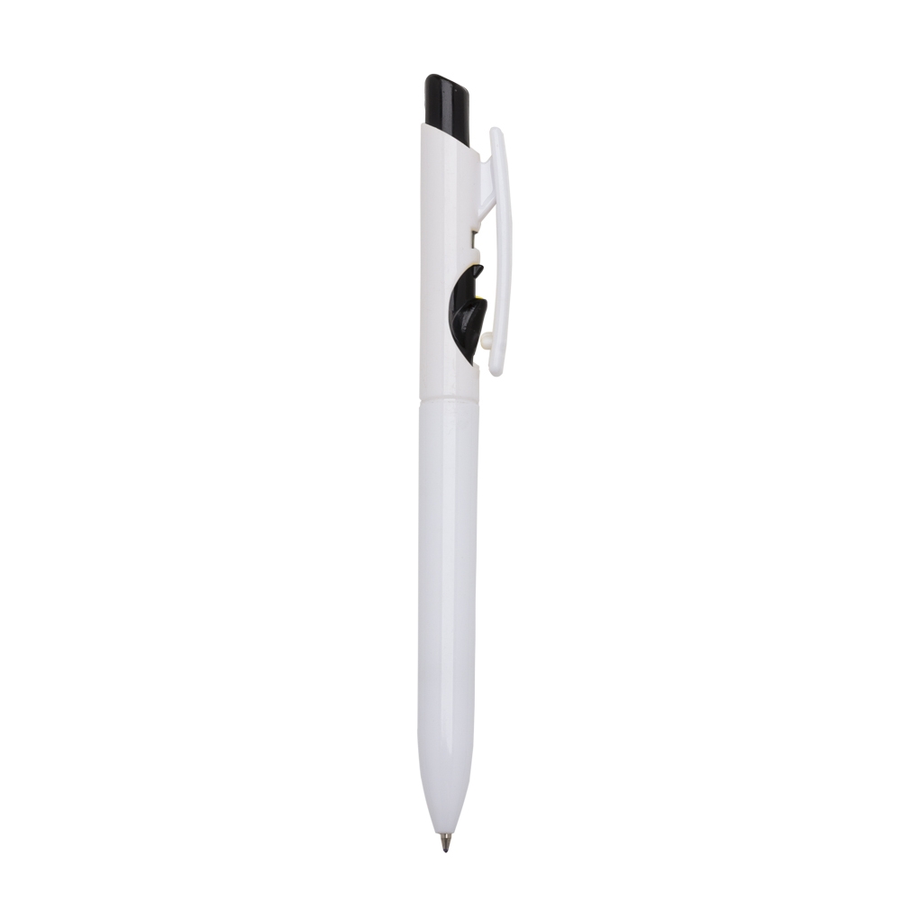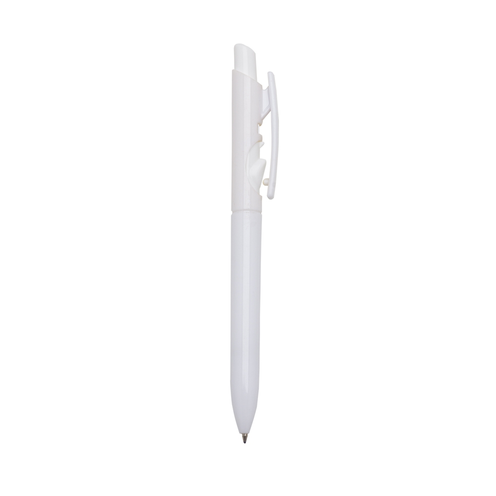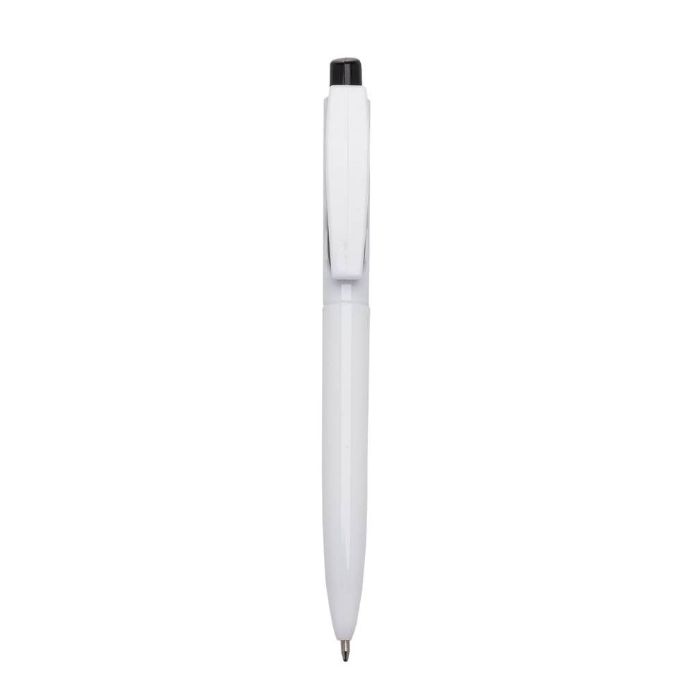 Caneta plástica com carga esferográfica azul e acionamento por clique.