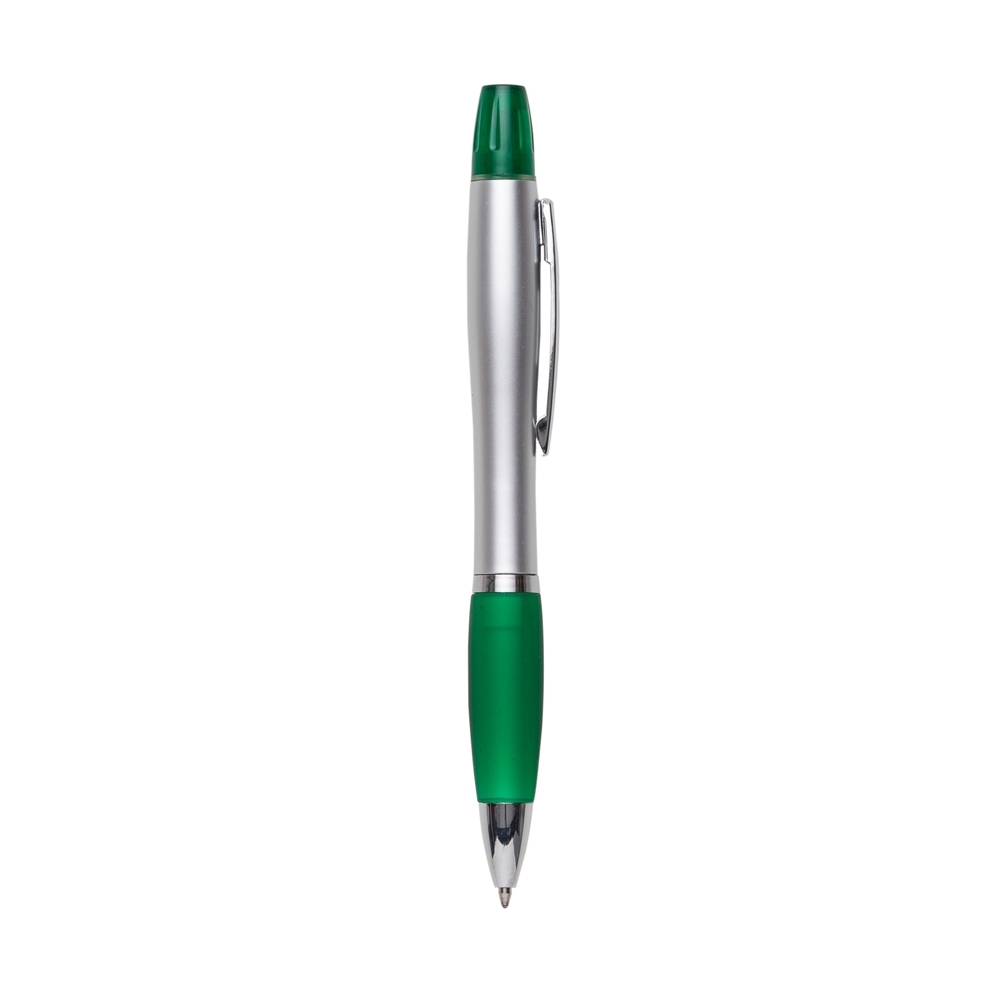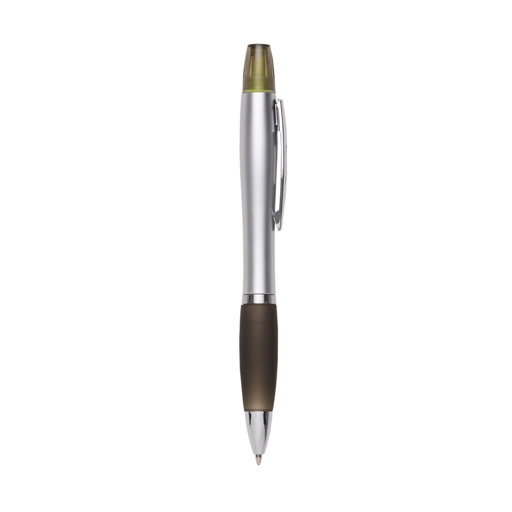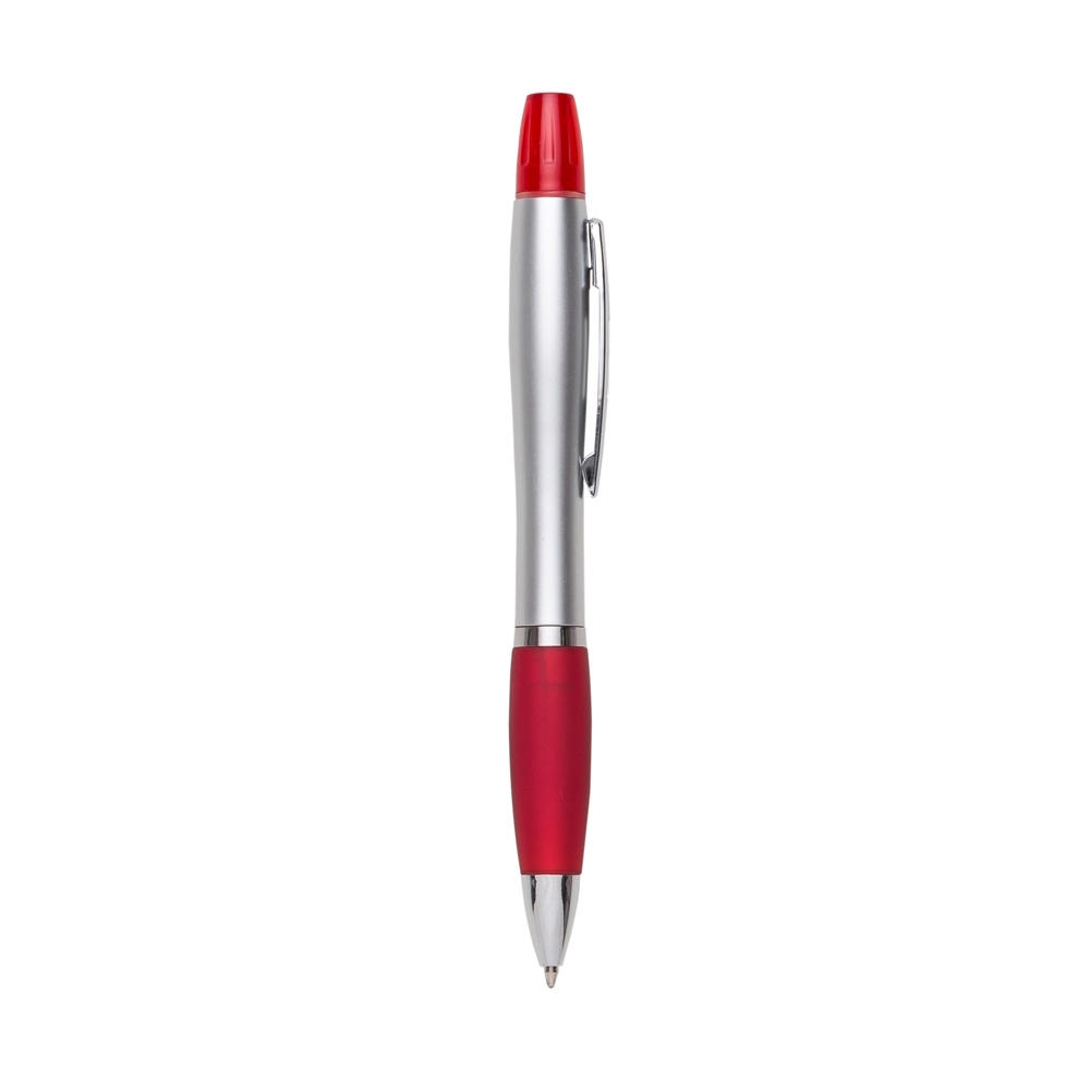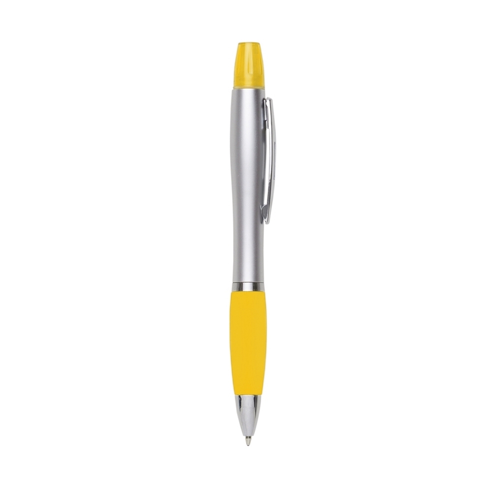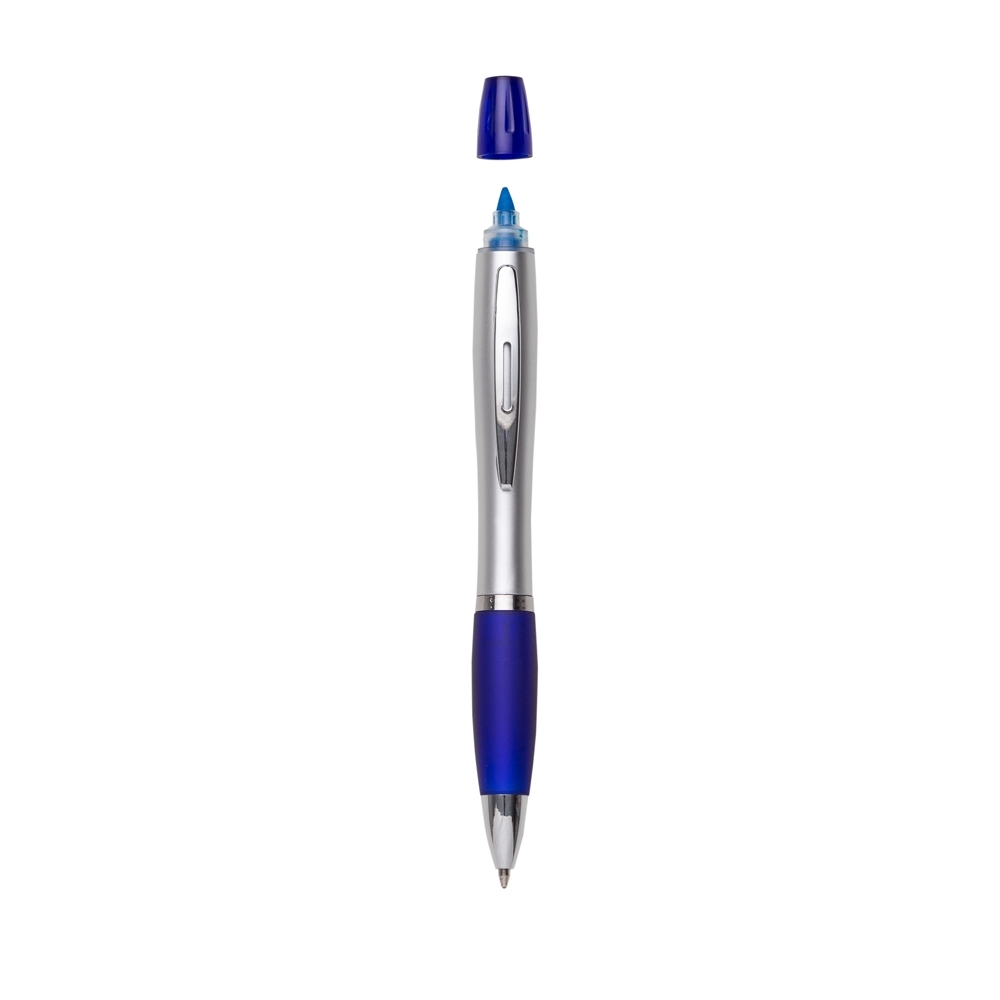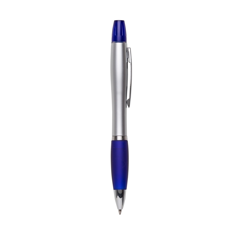 Caneta plástica com marca texto, contém detalhe emborrachado e tampa protetora para o marca texto. Carga esferográfica azul e acionamento por rotação.
