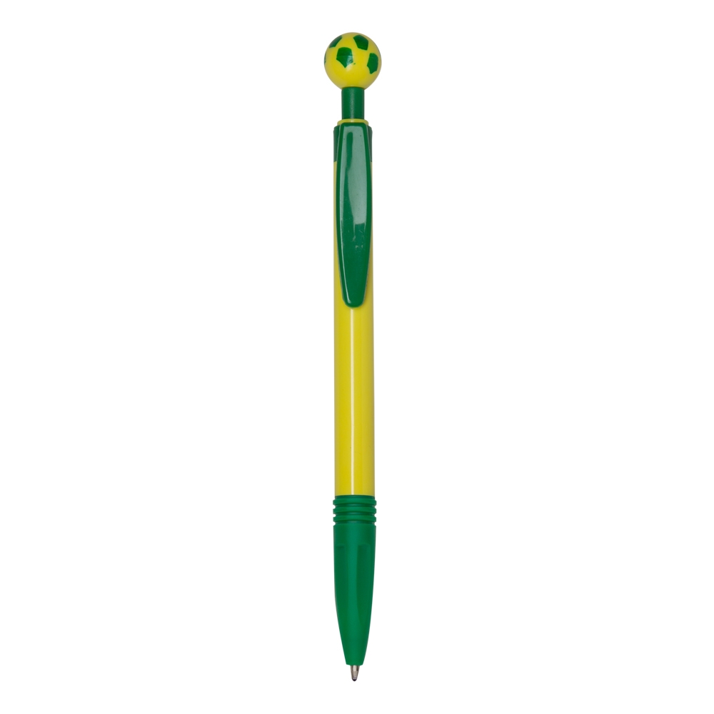 Caneta plástica com carga esferográfica azul e acionamento por clique.