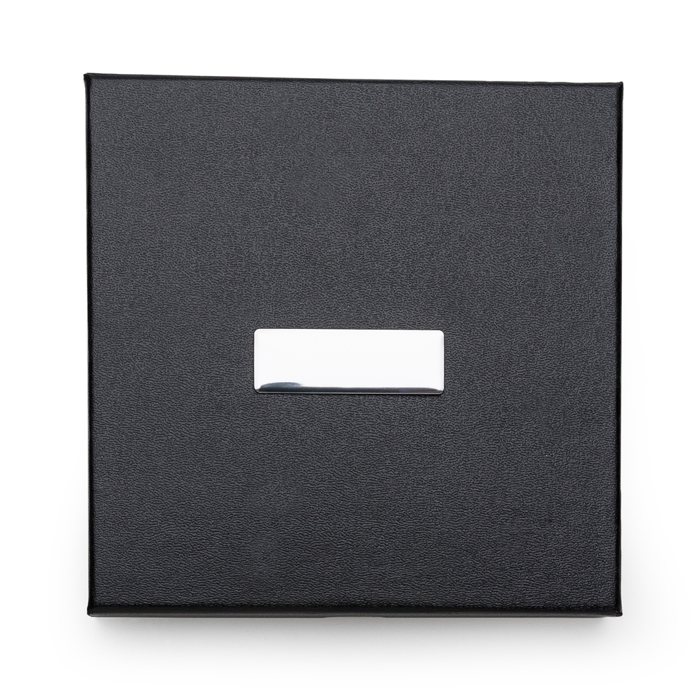 Kit executivo 2 peças em estojo de papelão com tampa e parte interna revestida de espuma. Contém: caneta metal preta com anel, detalhes em prata e escrita preta caderneta emborrachada com aproximadamente 80 folhas amarelas com pauta. Acompanha placa metálica para gravação.