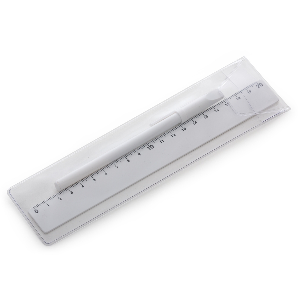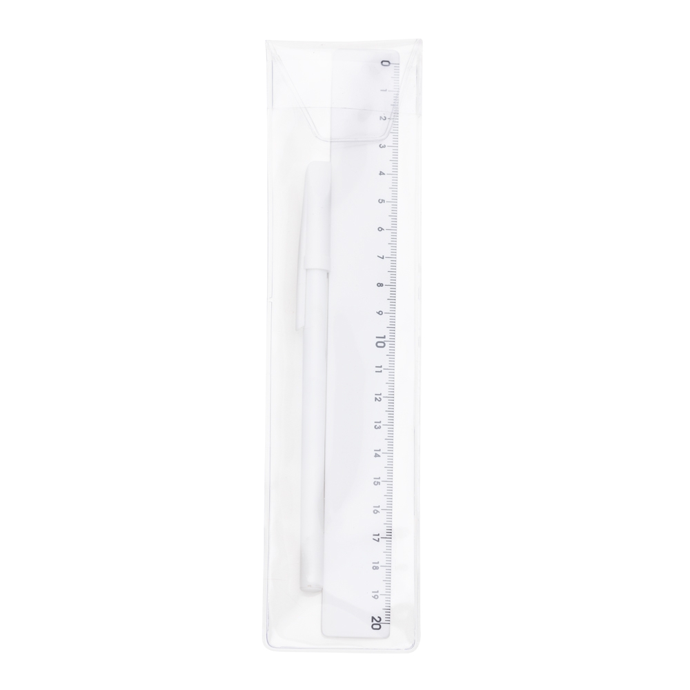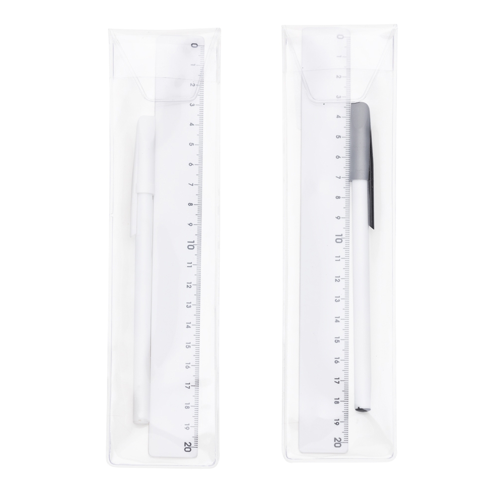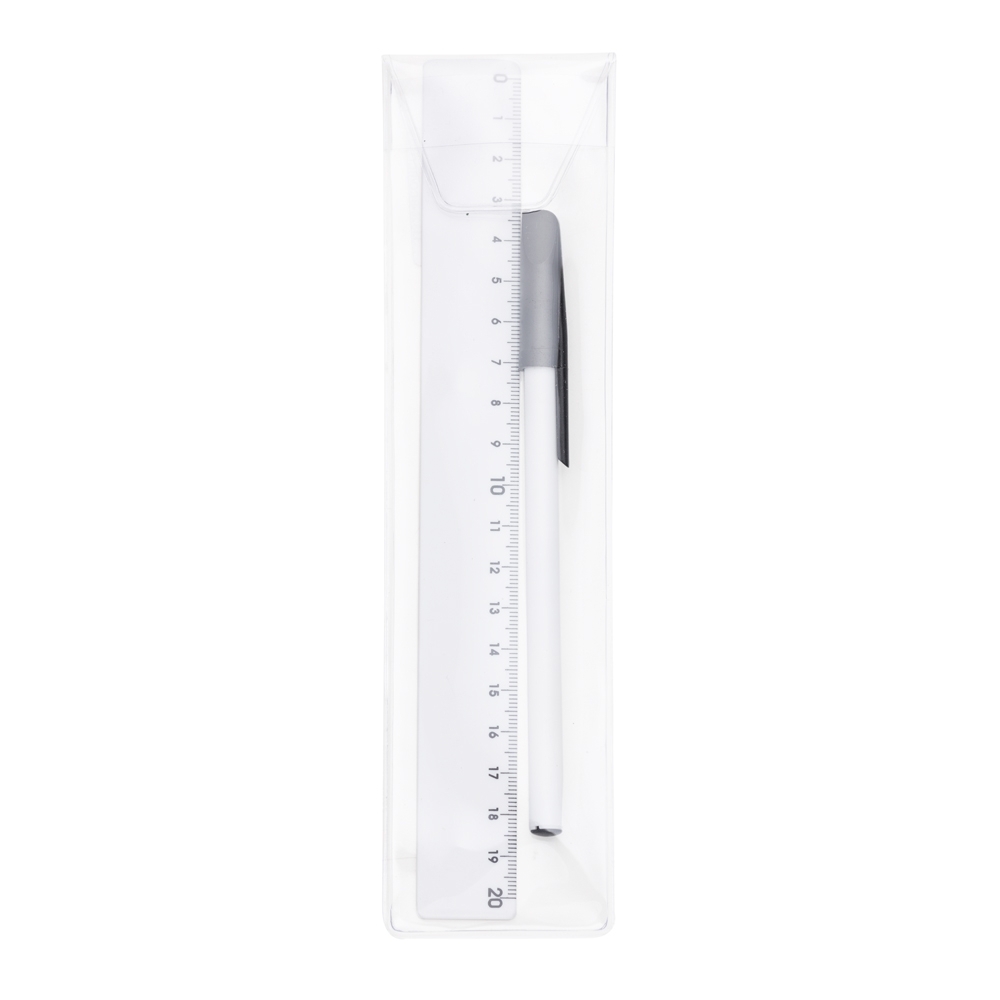Kit régua e caneta plástica em estojo plástico transparente. Caneta simples com tampa e régua de 20cm.
