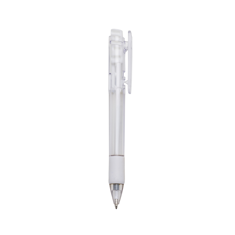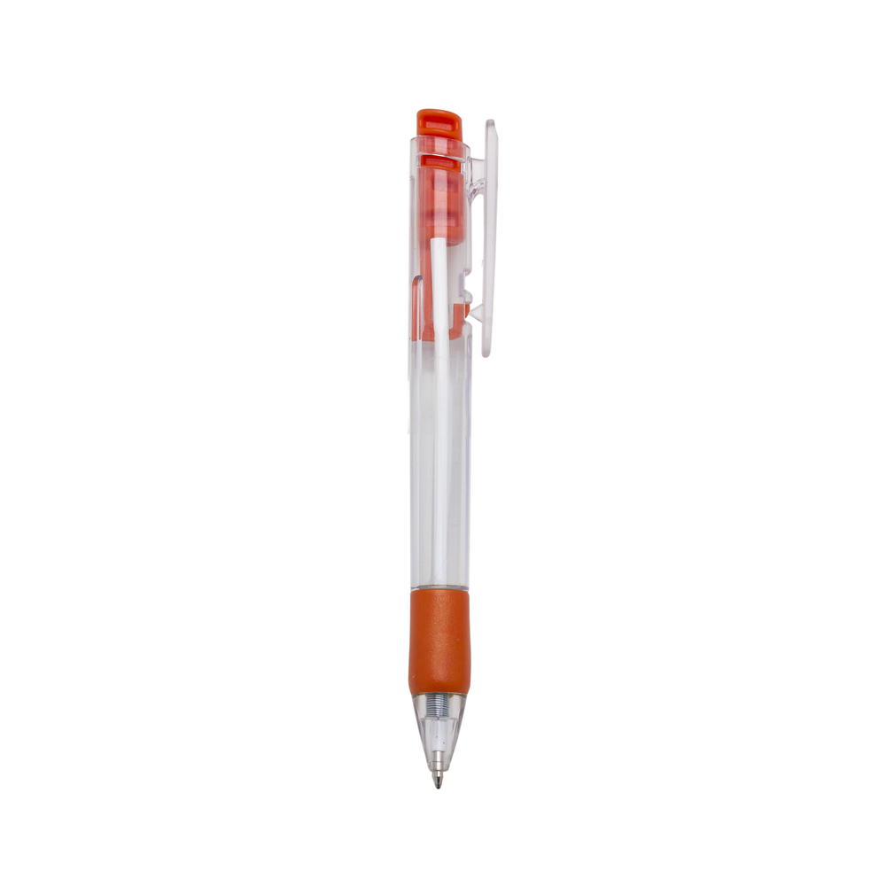Caneta plástica com carga esferográfica azul e acionamento por clique.