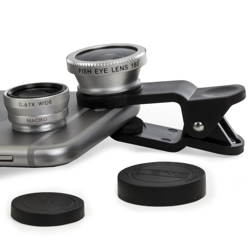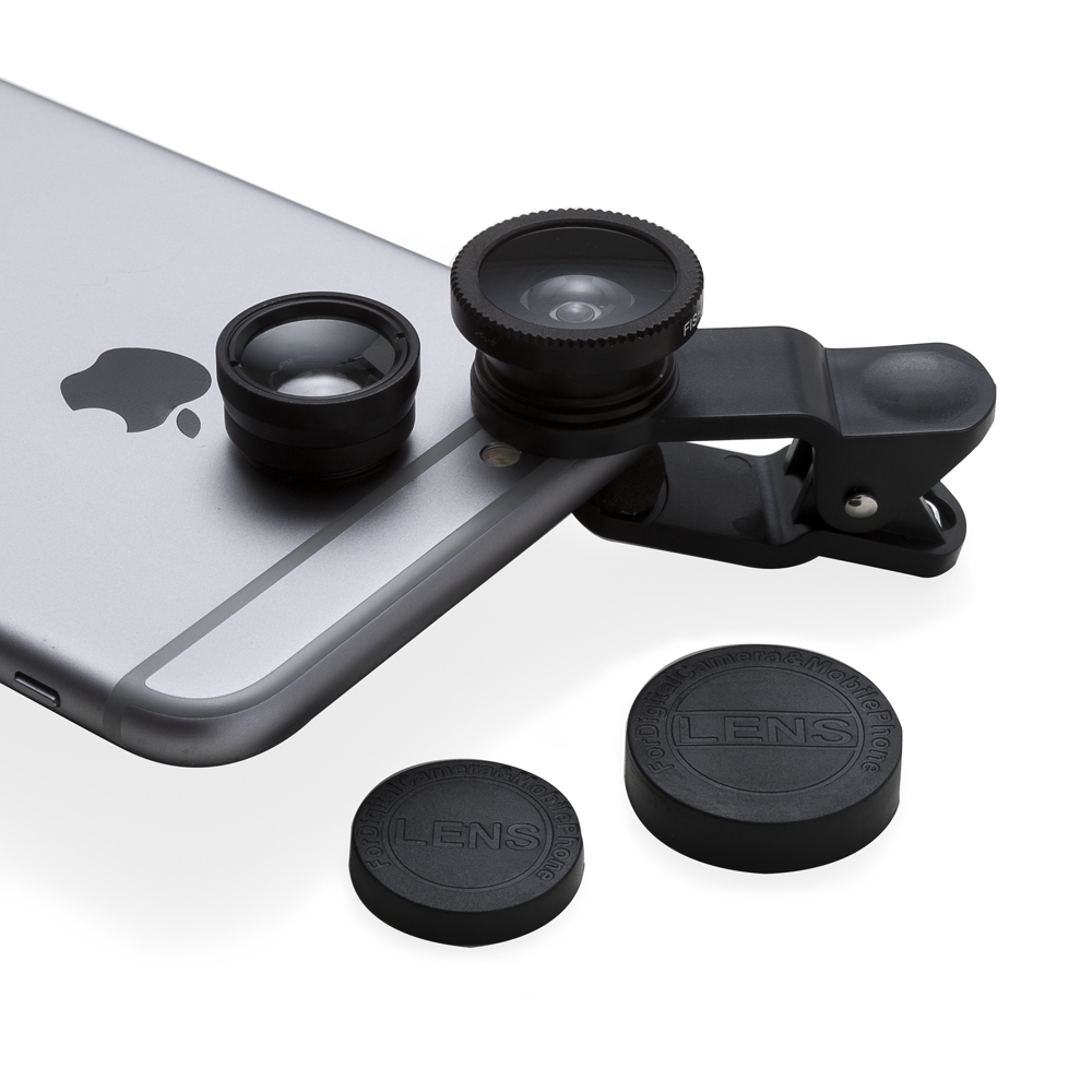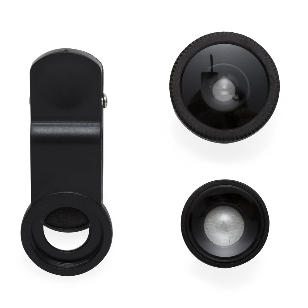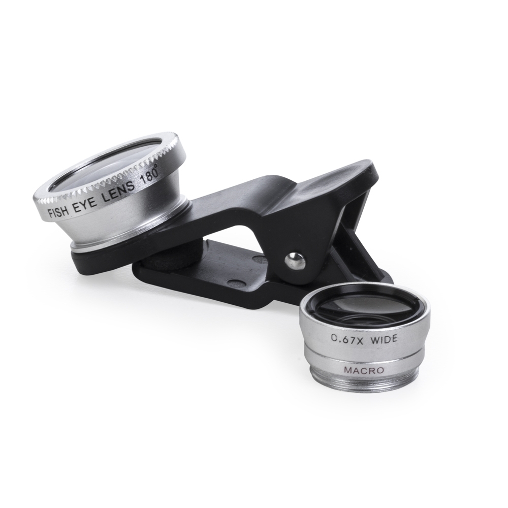 Conjunto universal de lentes para celular. Possui lente fish eye, lente macro, lente wide angle e prendedor Basta rosquear as lentes no prendedor e posicioná-lo na câmera do celular para seu funcionamento. Acompanha veludo para guardar os itens.