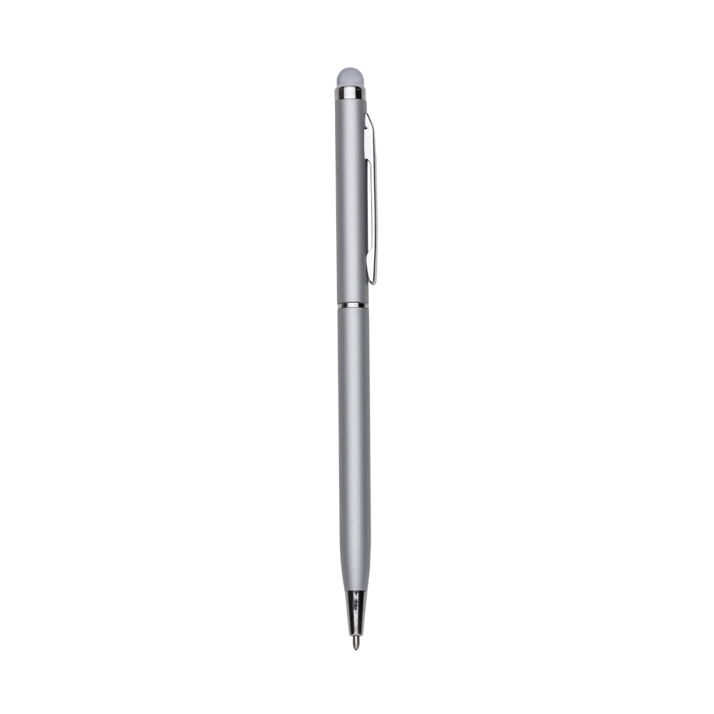 Caneta metálica com touch screen, carga esferográfica azul e acionamento por rotação.