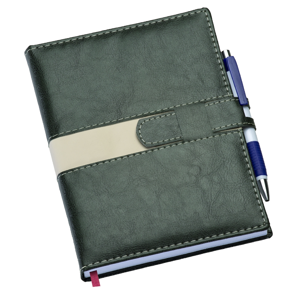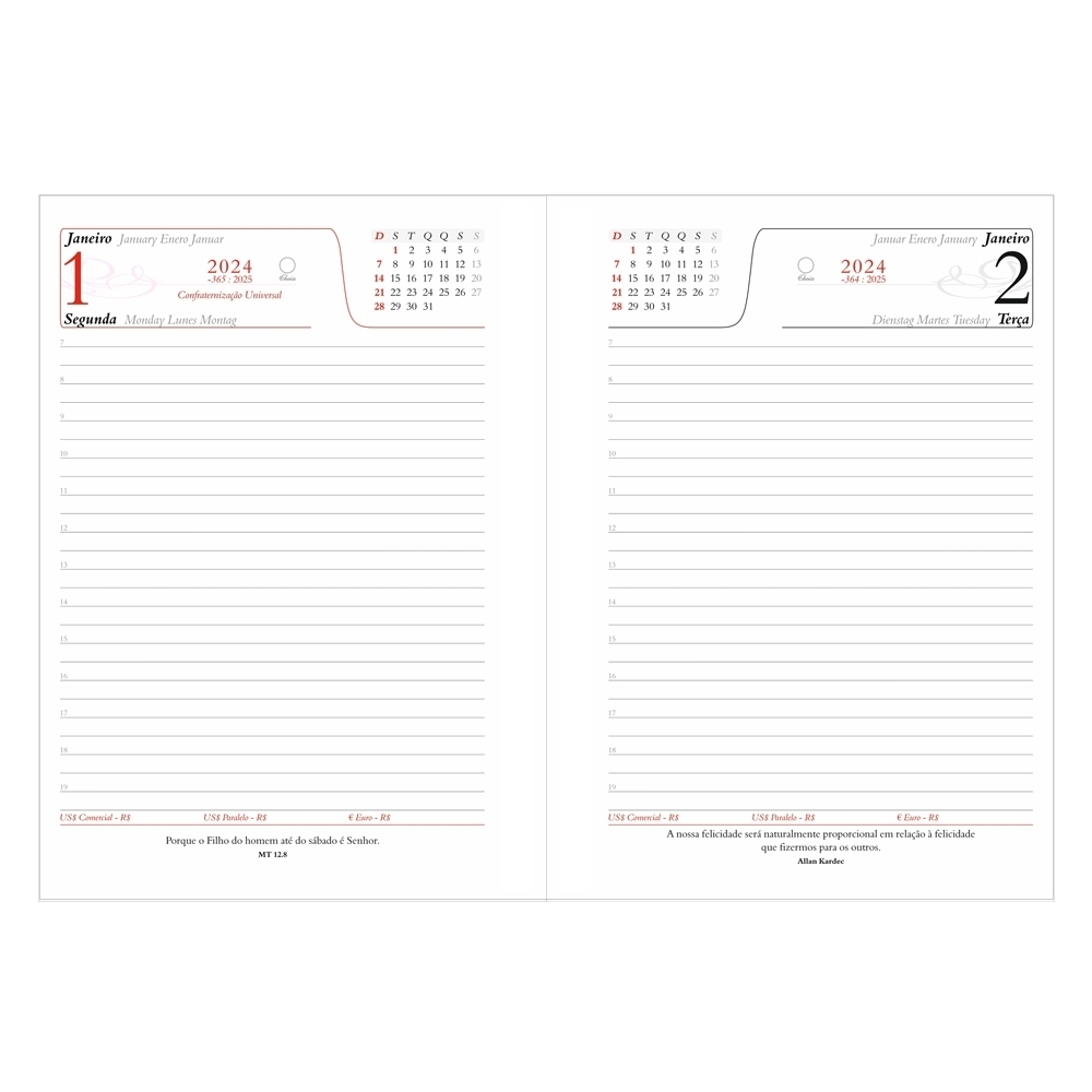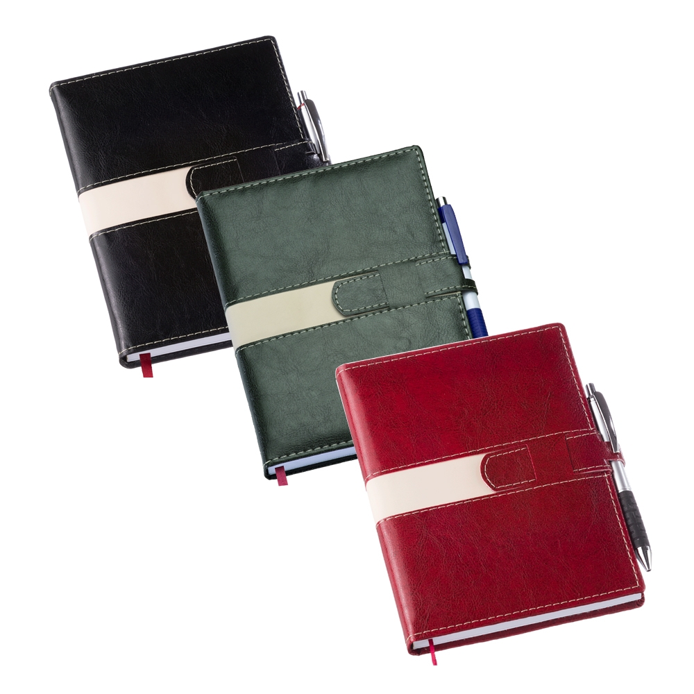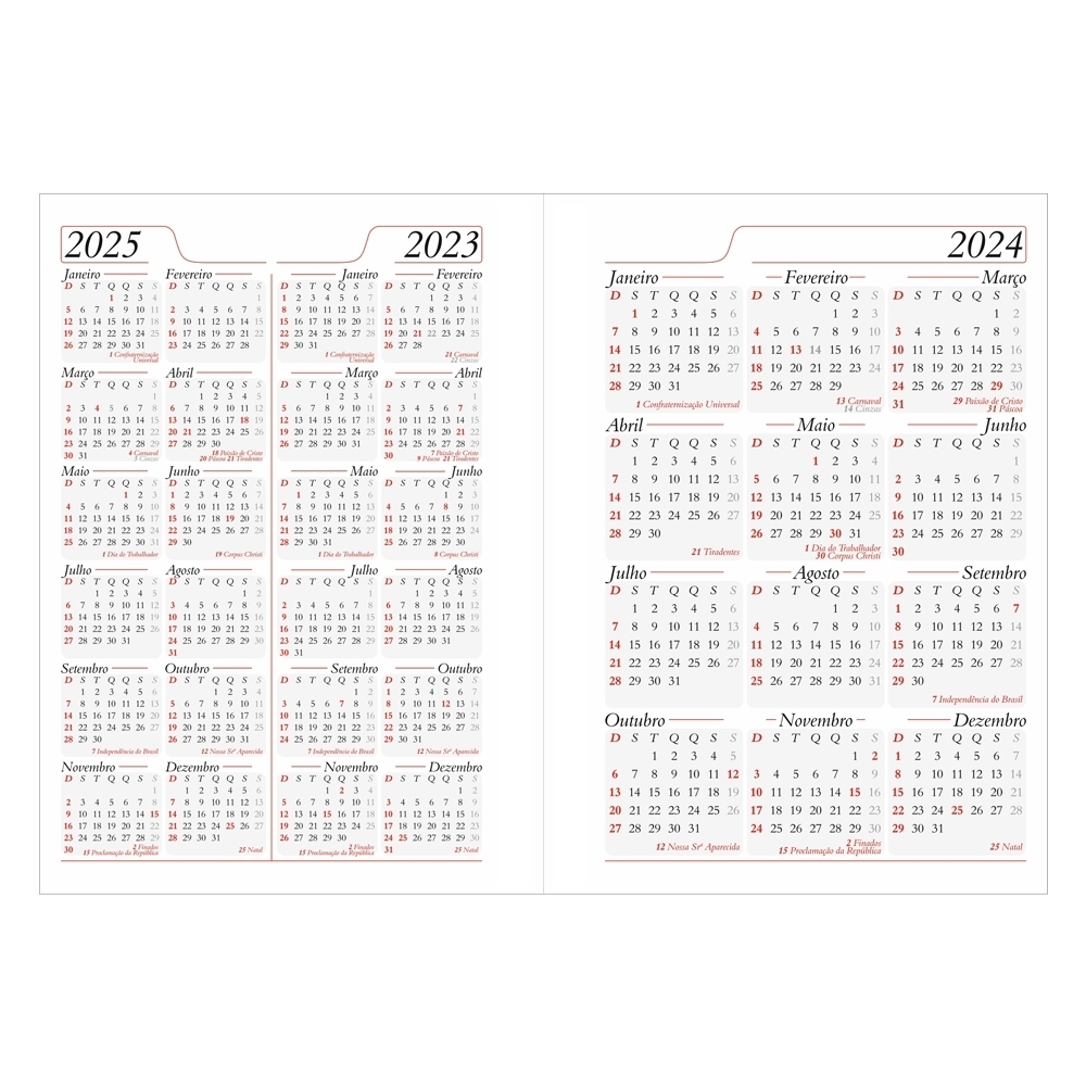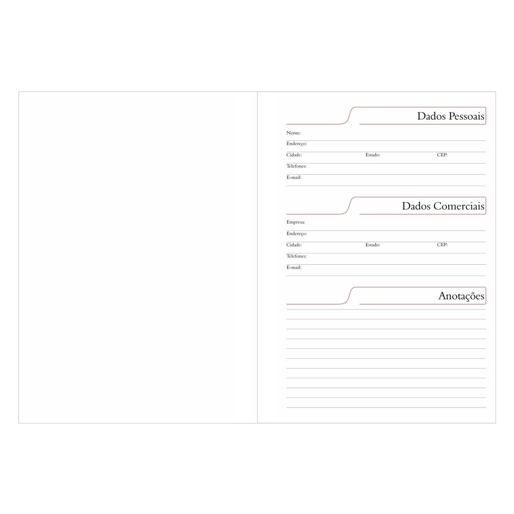 Agenda diária 2024 de couro sintético com fecho e suporte para caneta. Contém fita de cetim marca página, dados pessoais, calendário de 2023 à 2025, endereços da internet, mapa do Brasil, mapa-múndi, índice telefônico e planejamento. Possui uma faixa bege central. OBS.: IMAGEM MERAMENTE ILUSTRATIVA, NÃO ACOMPANHA CANETA! PEDIDOS APENAS MÚLTIPLOS DE 10 PEÇAS!