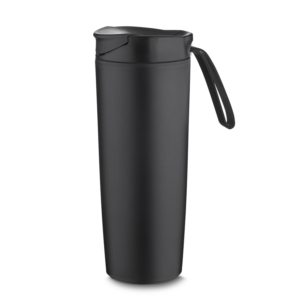 Copo plástico anti queda 400ml de pintura preto fosco com alça emborrachada colorida. Tampa rosqueável com abertura de bocal, parte inferior do produto possui ventosa.
