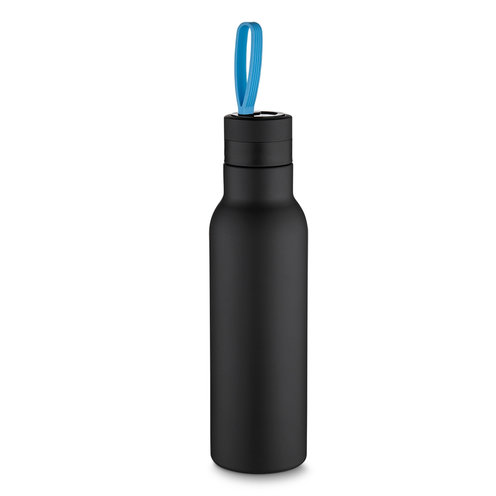 Garrafa parede dupla 500ml com pintura preto fosco e alça colorida. Tampa rosqueável e parte inferior com borracha antideslizante.
