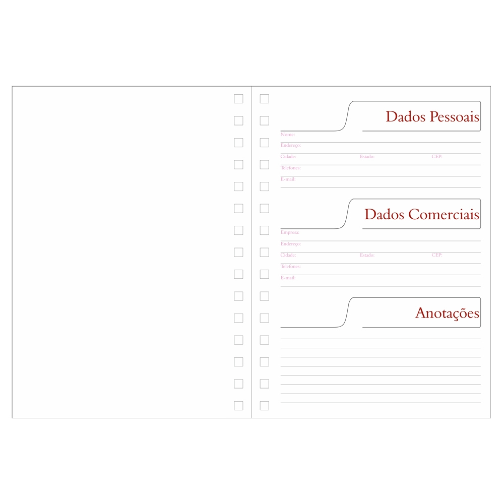 Agenda permanente com capa pet sublimática e wire-o pré-fechado. Possui folha envelope plástica, dados pessoais, contatos, mapa Brasil, mapa Mundi e anotações. Informações do fornecedor para sublimação: temperatura 200ºC, tempo 40/60 segundos. OBS.: PEDIDOS APENAS MÚLTIPLOS DE 10 PEÇAS!
