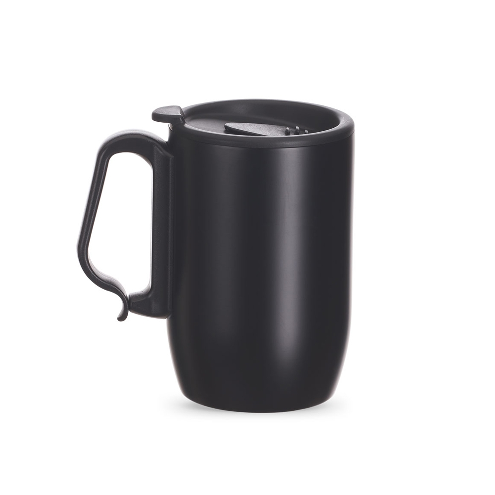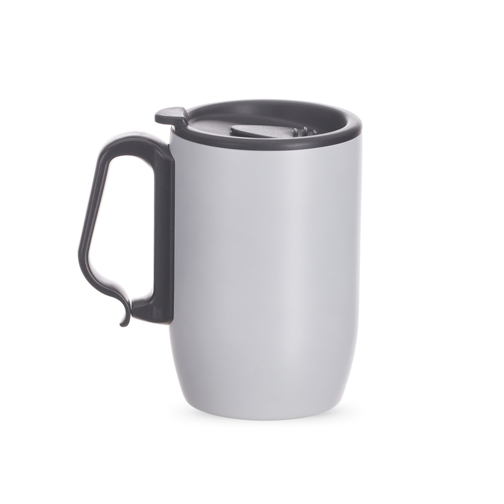 Caneca inox 350ml com parede dupla. Possui tampa plástica com trava para abertura do bocal, alça plástica estilo mosquetão e base com apoio EVA. Obs.: Conserva temperatura.