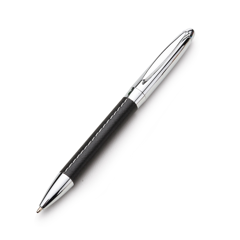 Caneta metálica com detalhe em couro sintético. Carga esferográfica azul e acionamento por rotação.