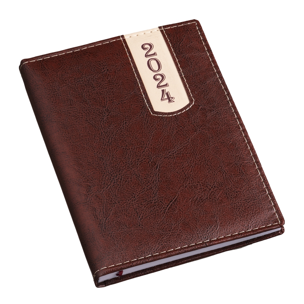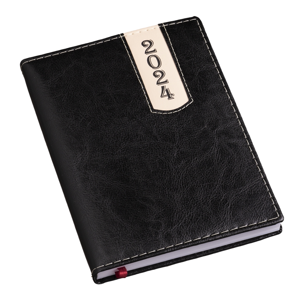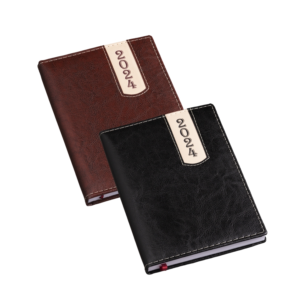 Agenda produzida em couro sintético, possui detalhes de costura e escrita do ano “2024” na parte superior direita. Contém marca página em cetim, páginas de dados pessoais, calendário de 2023 à 2025, mapa do Brasil, mapa global, índice telefônico e planejamento. OBS.: PEDIDOS APENAS MÚLTIPLOS DE 10 PEÇAS!