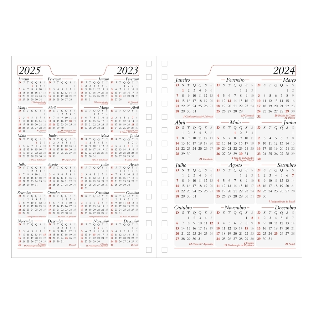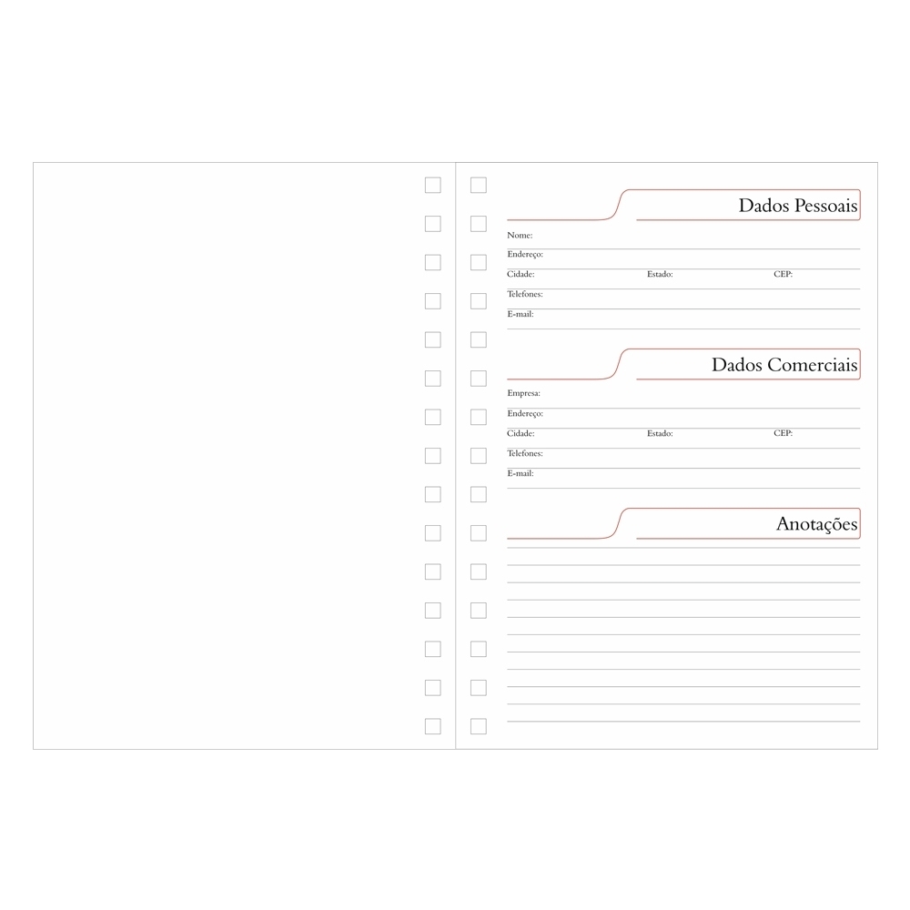 Agenda diária wire-o com capa produzida em prime, frente e verso liso, apenas com detalhe do ano ‘2024’ na parte superior direita. Contém “bolso” plástico atrás da capa, dados pessoais, calendário de 2023 à 2025, mapa do Brasil, mapa global, índice telefônico e planejamento. OBS.: PEDIDOS APENAS MÚLTIPLOS DE 10 PEÇAS!