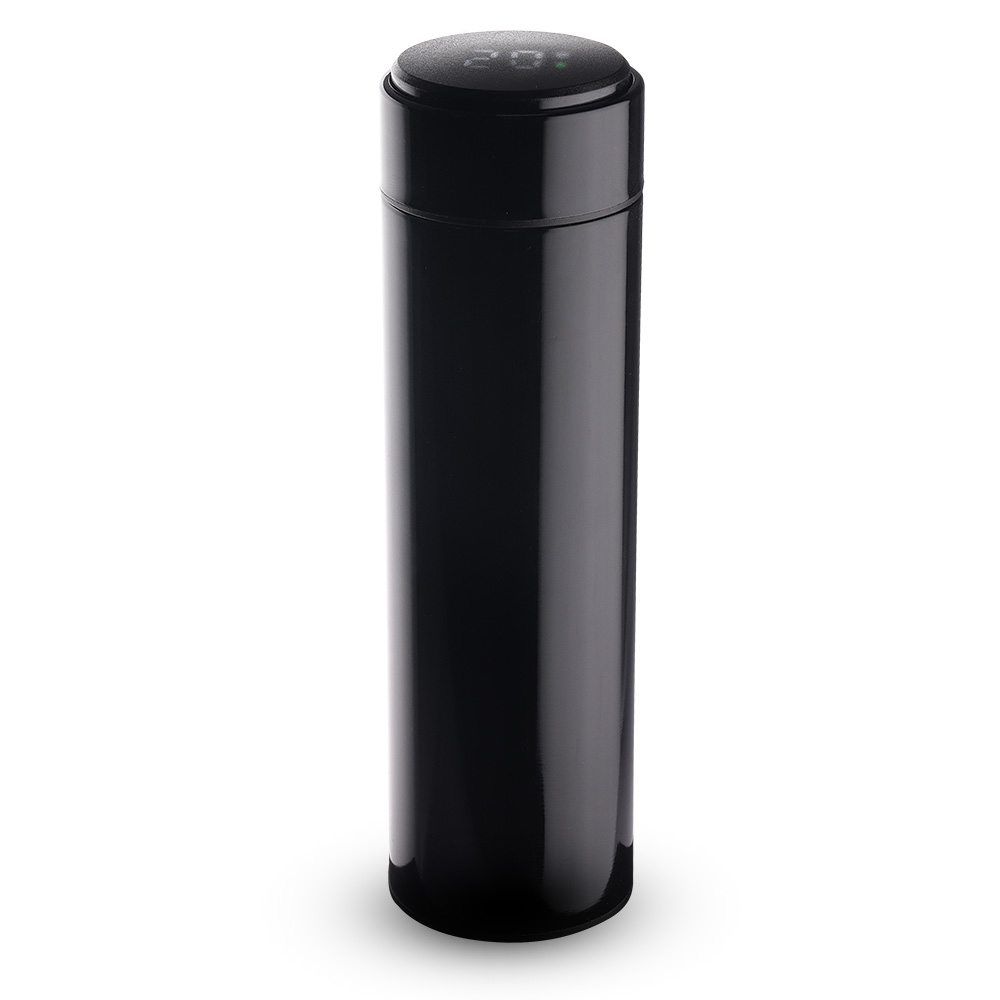 Garrafa inox 450ml com parede dupla, infusor e display LED com termômetro digital na tampa para indicar a temperatura do líquido. Conserva temperatura quente ou fria.