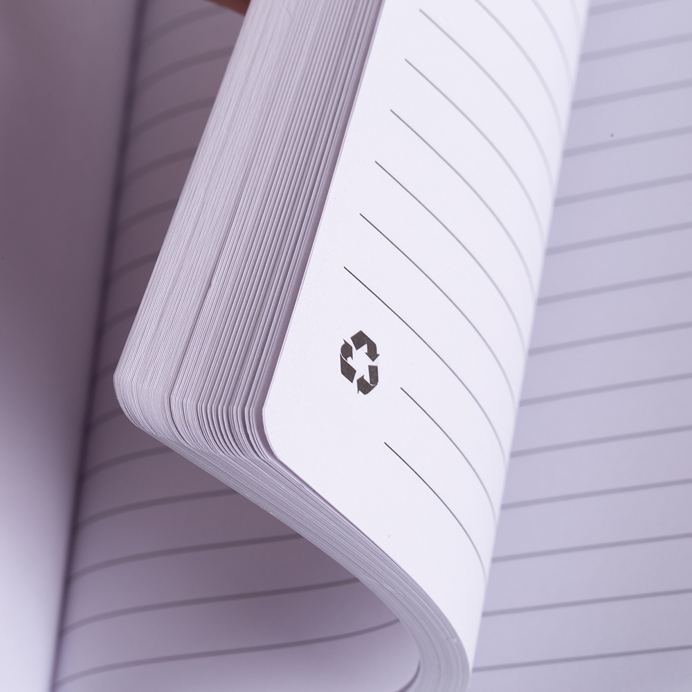 Bloco de anotações ecológico com porta caneta: Bloco de anotações com suporte para caneta, produzido em couro reciclado, aproximadamente 80 folhas brancas com pauta.