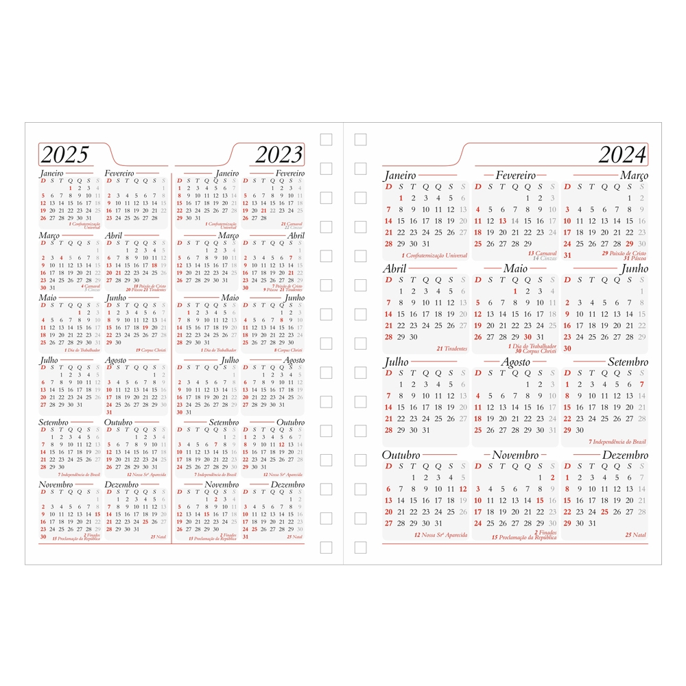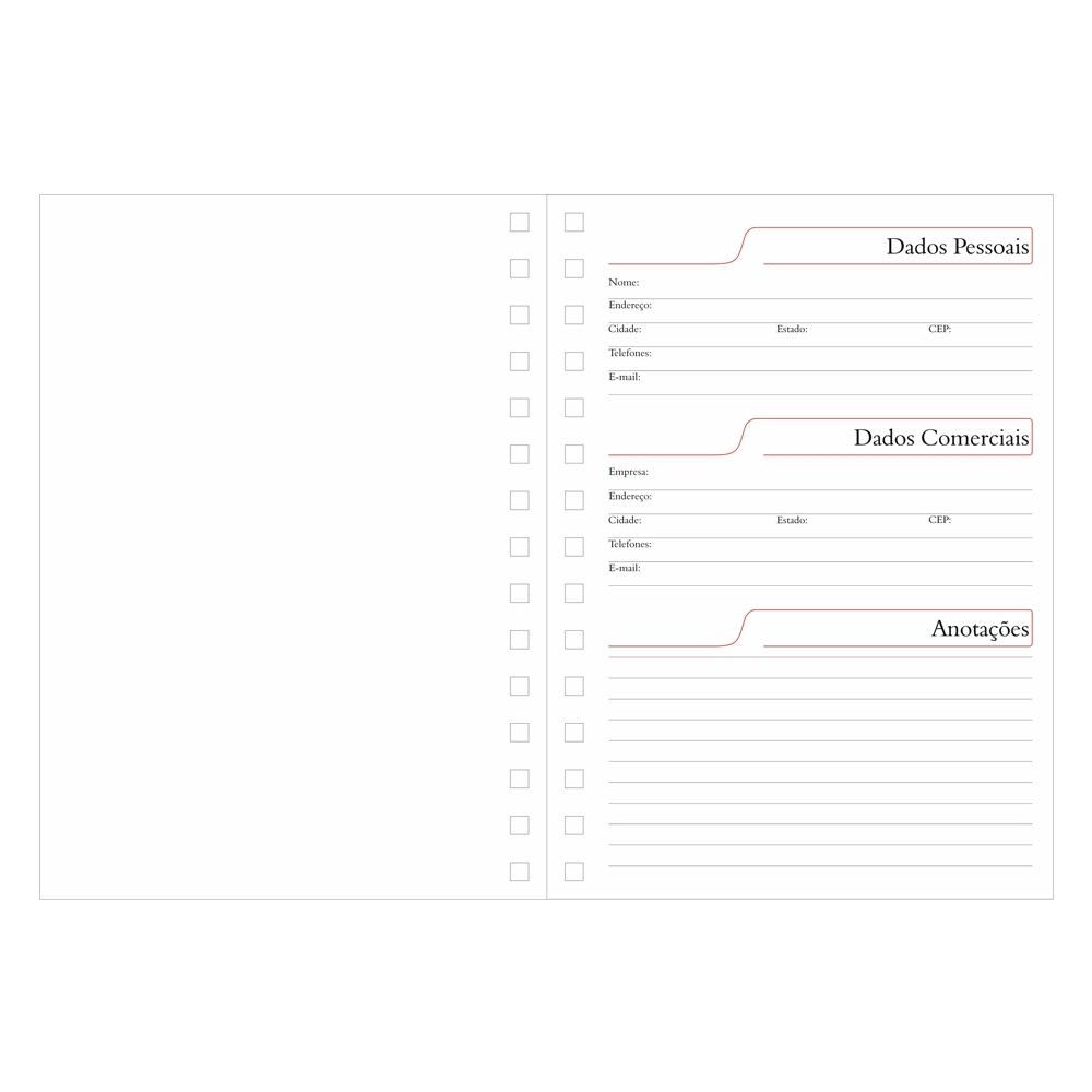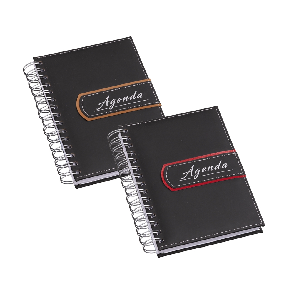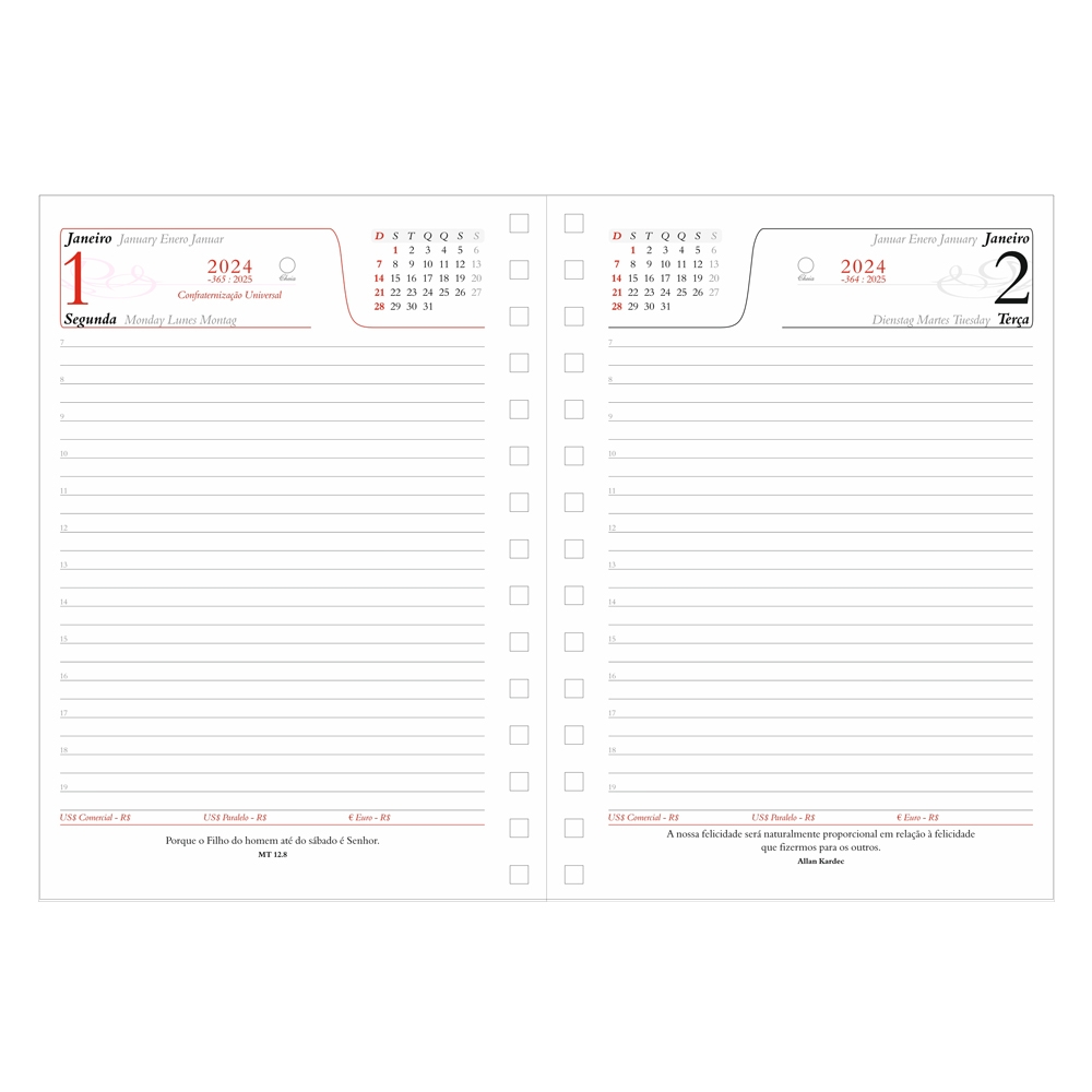 Agenda diária 2024 em couro sintético com wire-o. Possui “bolso” plástico, página para dados pessoais, calendário 2023 á 2025, mapa do Brasil, mapa global, índice telefônico e planejamento.