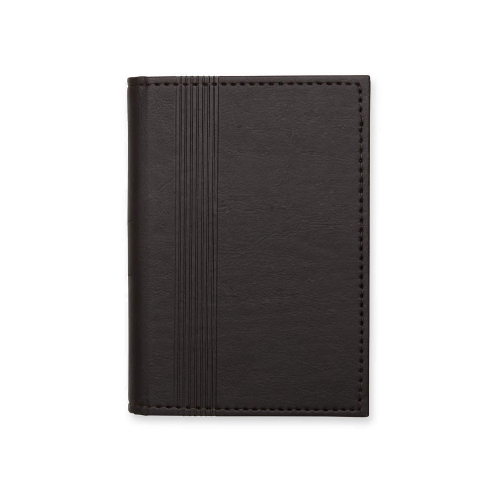 Bloco de anotações em couro sintético com porta caneta e compartimento para arquivar folhas. Possui aproximadamente 80 folhas marfim sem pauta.