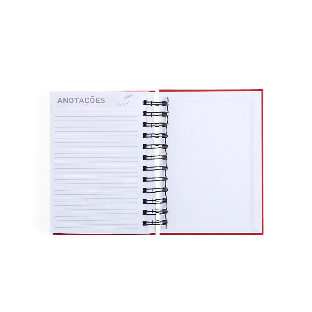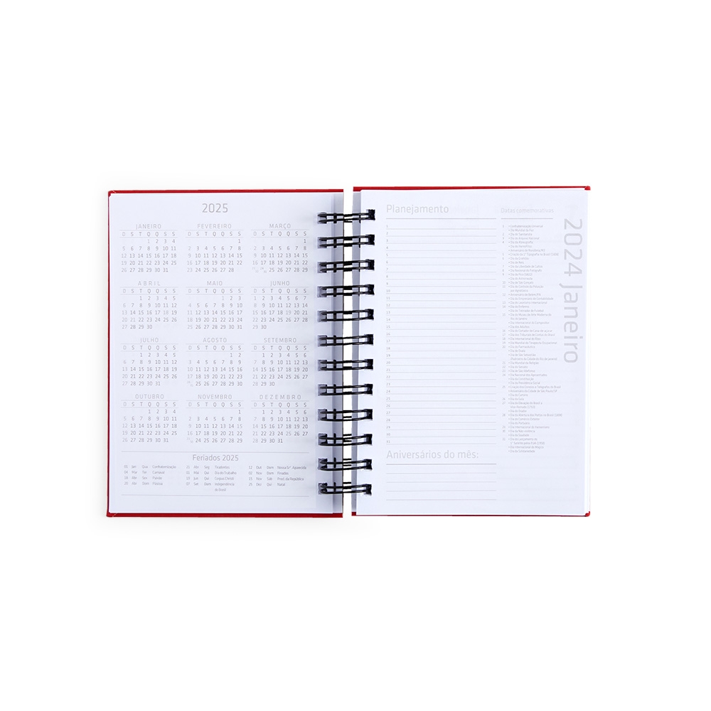 Agenda 2024 com capa emborrachada e wire-o metálico. Contém páginas para dados pessoais, calendários de 2023 à 2025, planejamento e anotações.