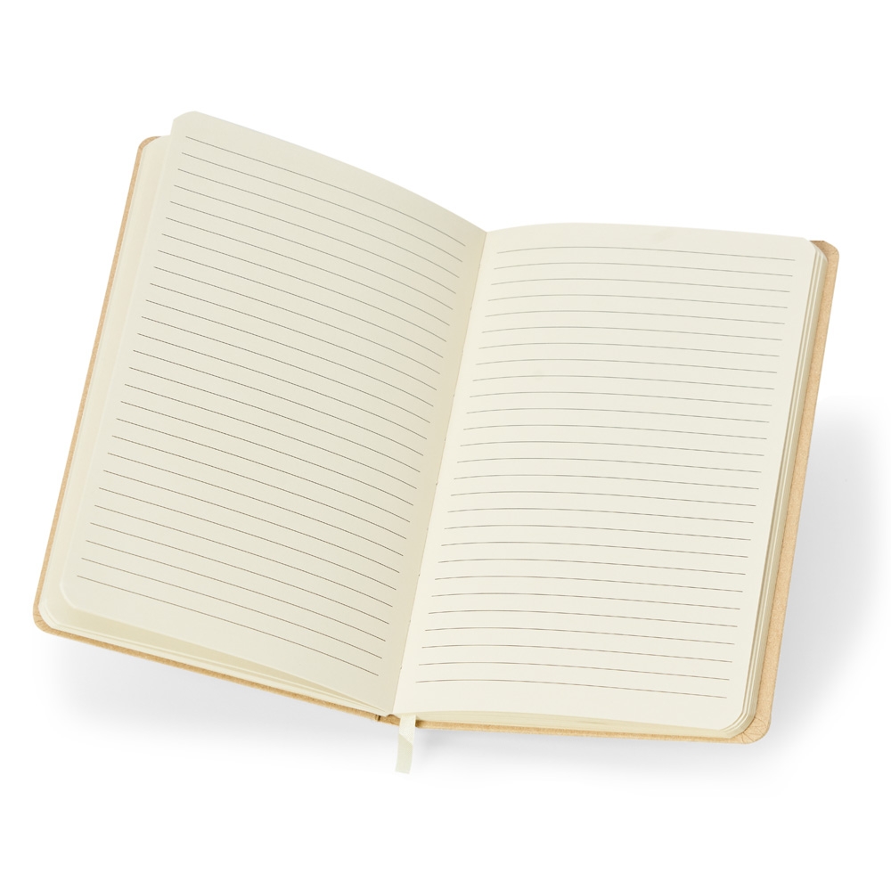 Caderneta de kraft com marca página em cetim e elástico para lacre. Contém aproximadamente 80 folhas marfim sem pauta.