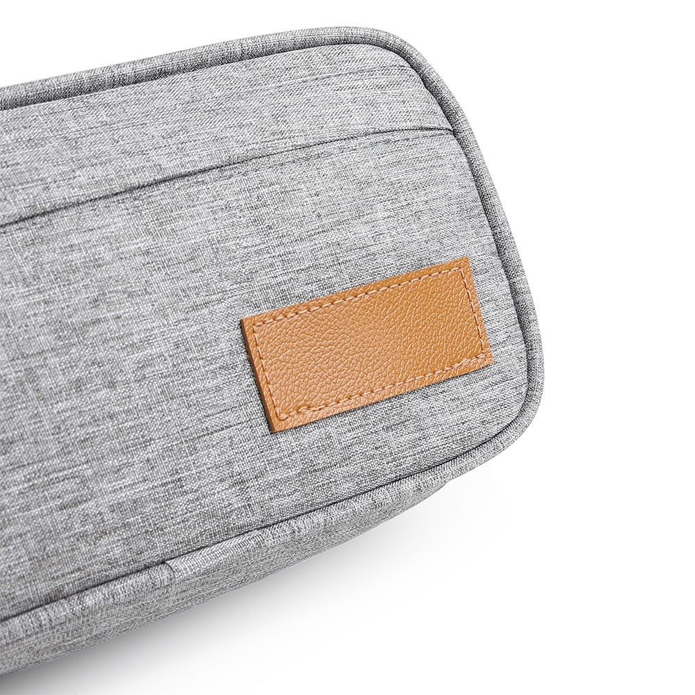 Necessaire confeccionada em poliéster com detalhes em couro sintético, possui dois compartimentos com zíper, alça para transporte e alça pequena para acesso de chaveiro ou gancho.