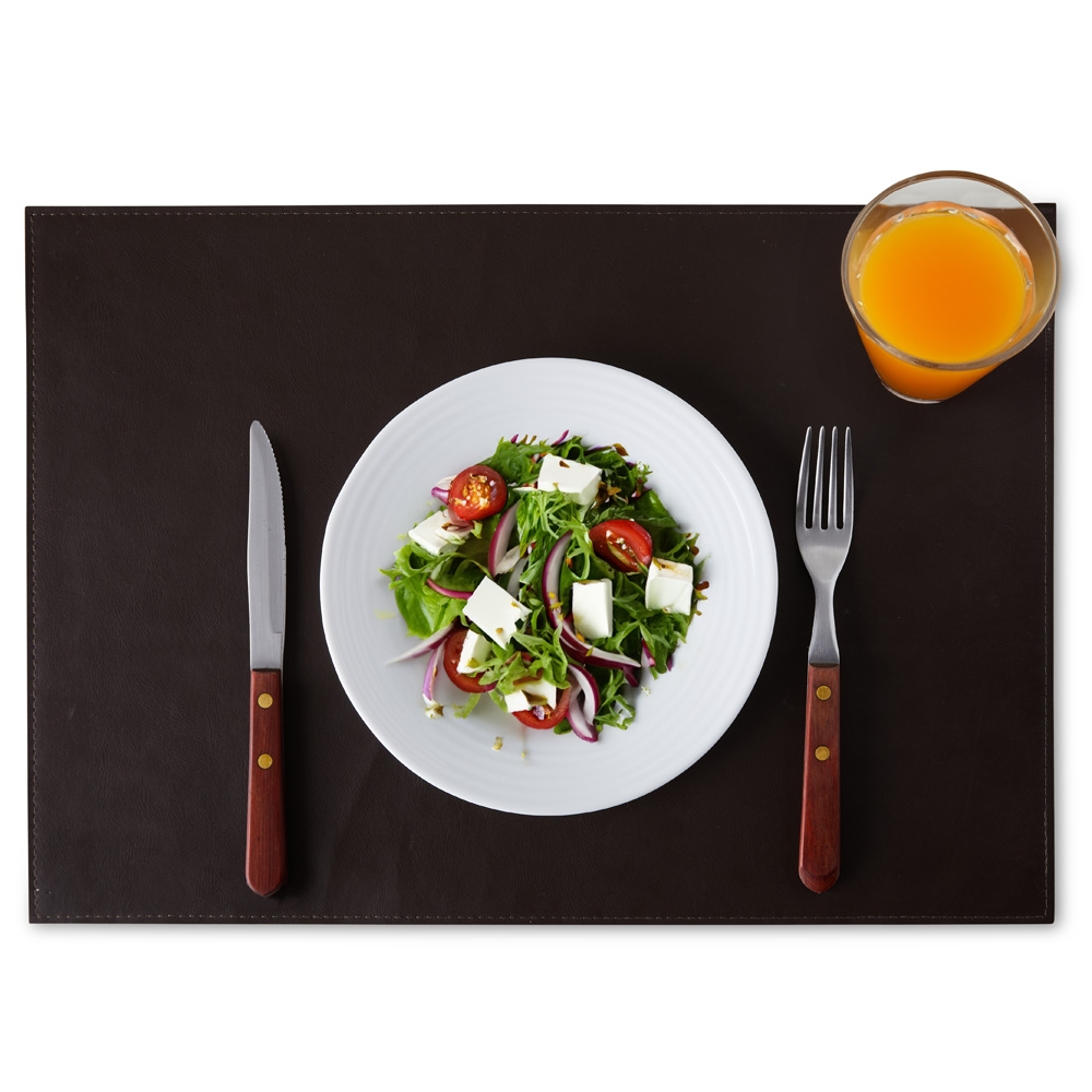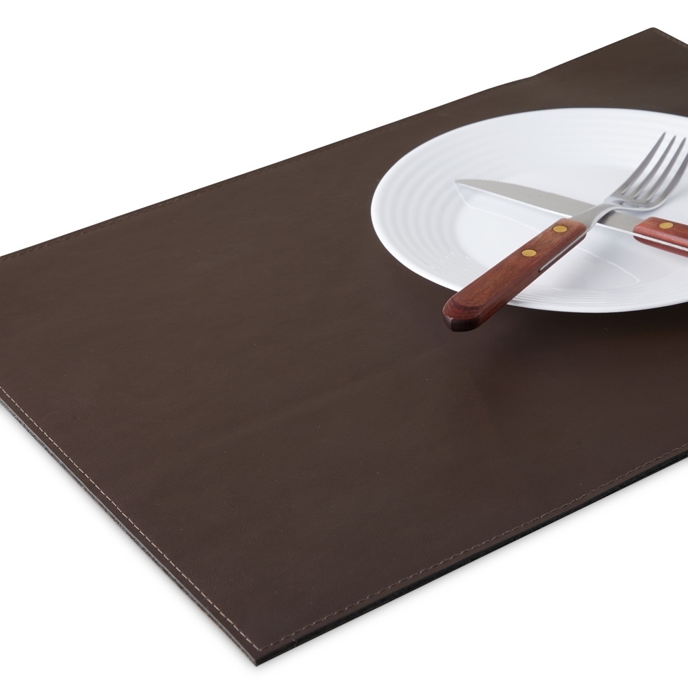 Lugar Americano dupla face, couro sintético. Sendo uma face na cor preto e a outra na cor marrom.