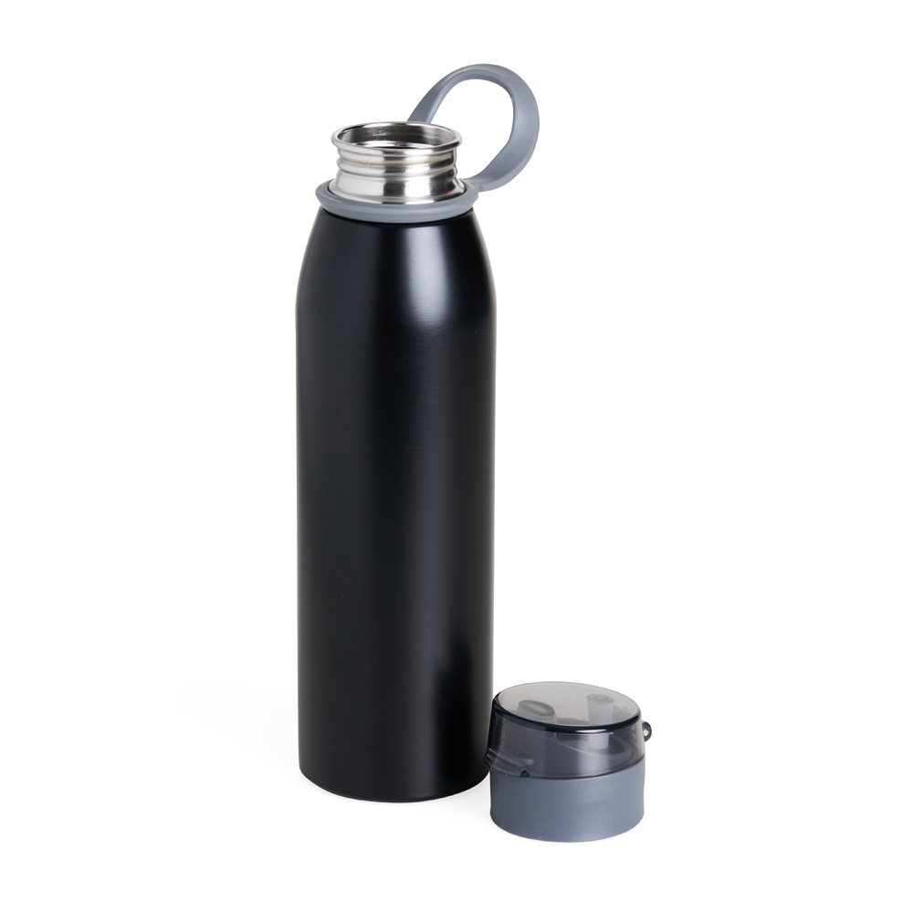 Garrafa 650ml em inox. Tampa plástica rosqueável com proteção para o bocal e alça emborrachada para transporte