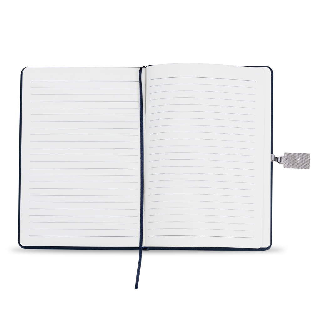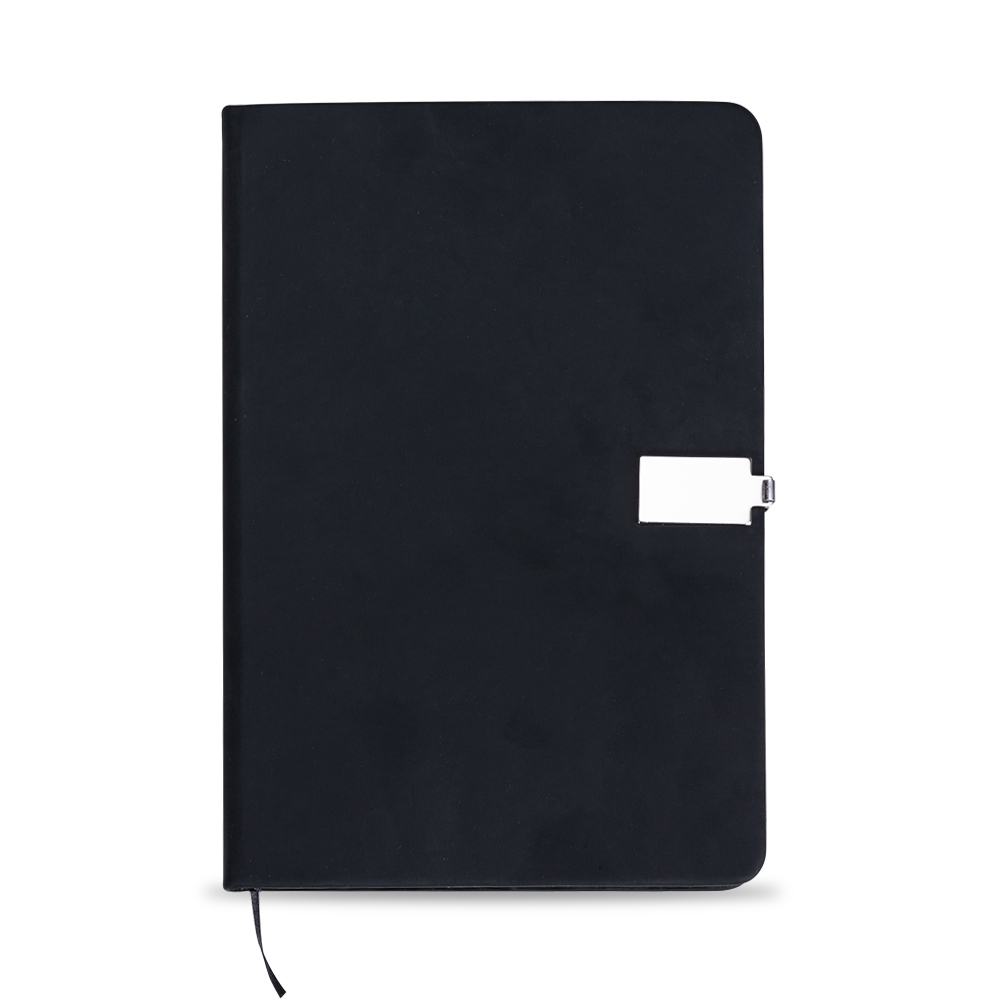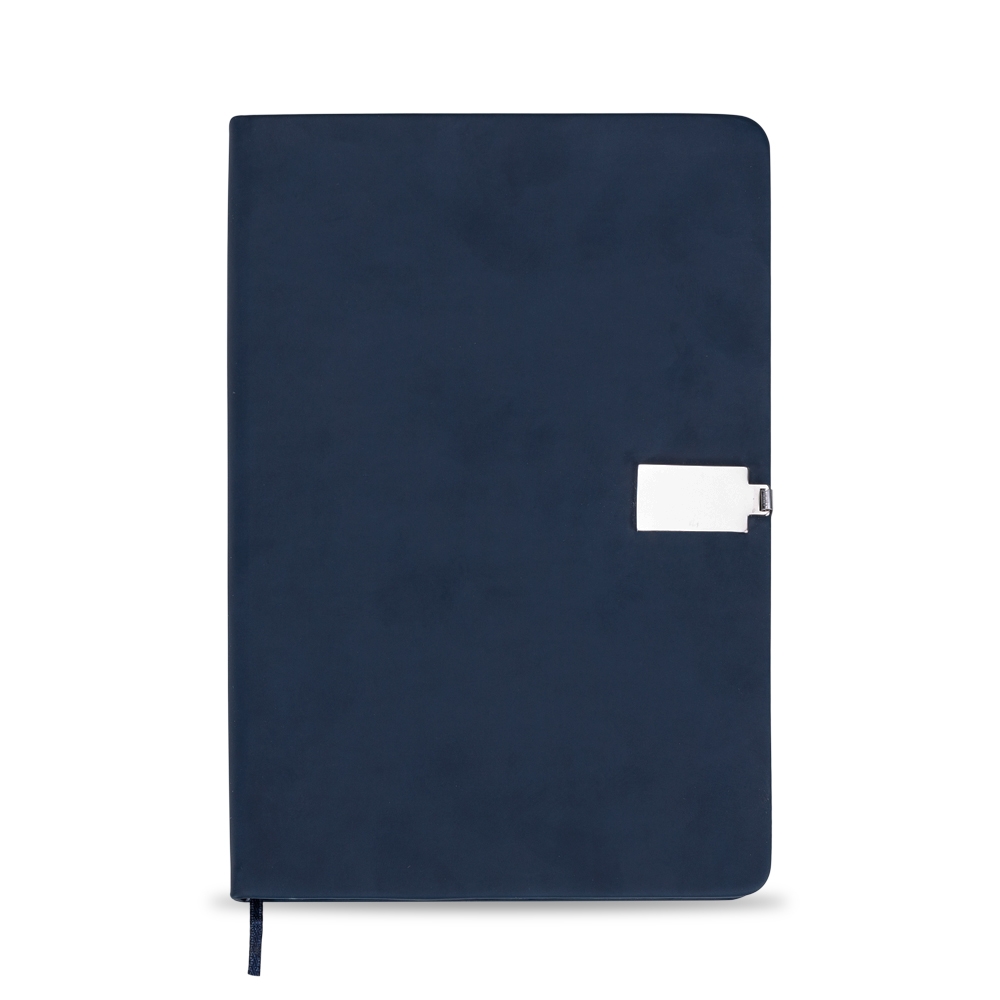 Bloco de anotações emborrachado com fecho metálico imantado. Possui aproximadamente 96 folhas amarelas pautadas e marca página de cetim.