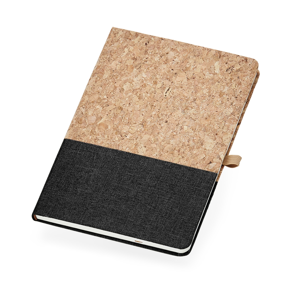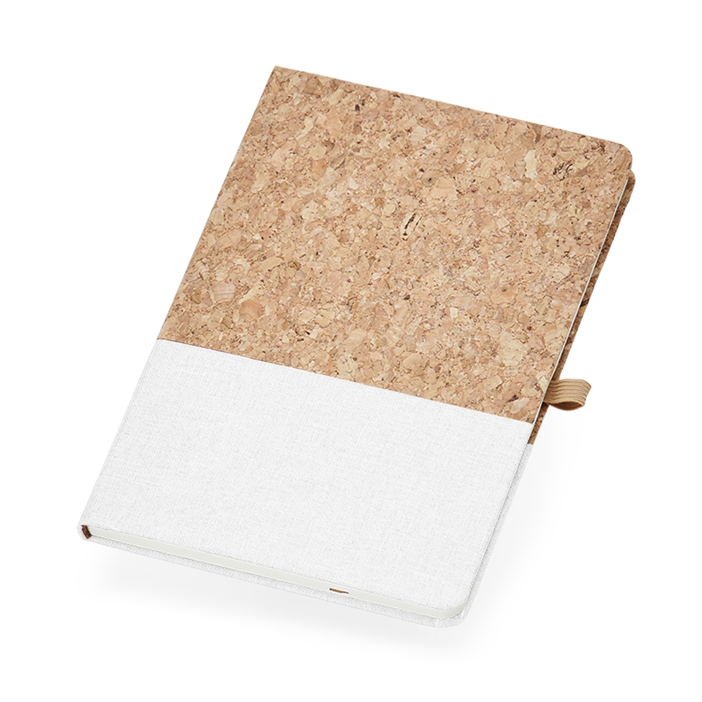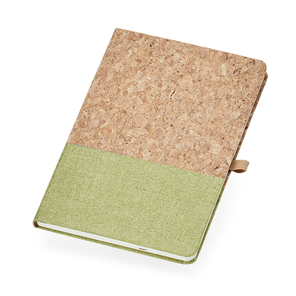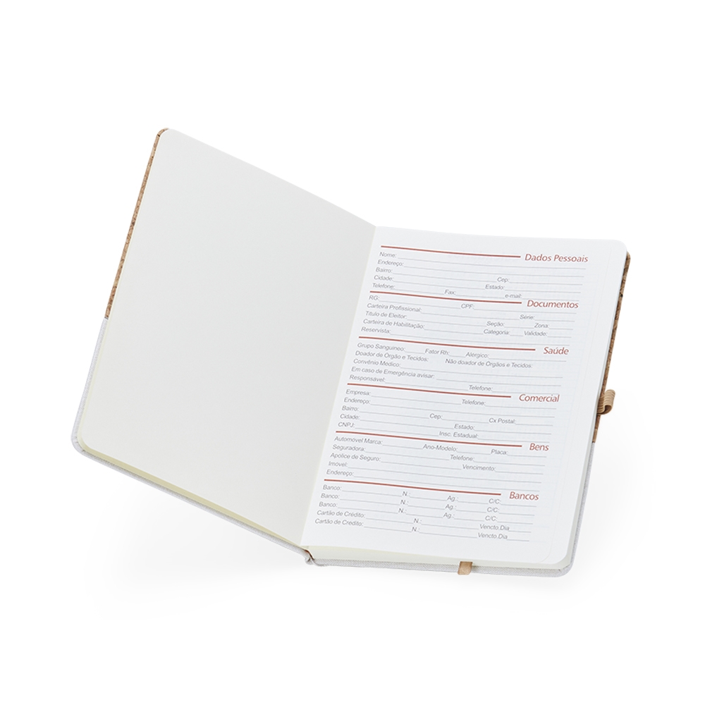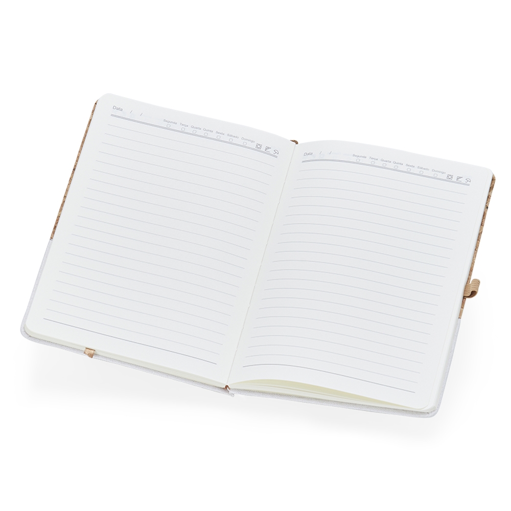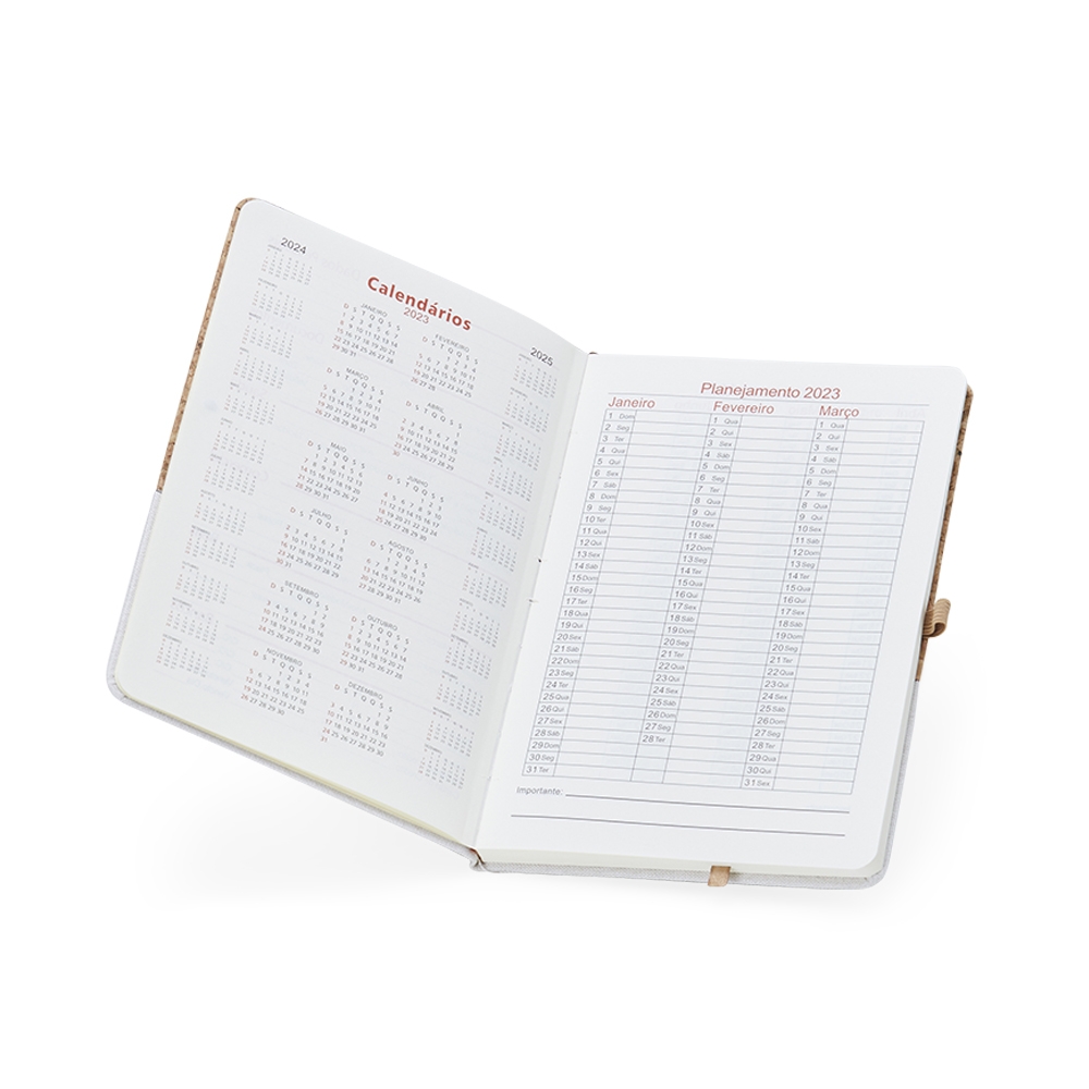 Caderneta A5 de cortiça com detalhe em linho e suporte para caneta, contém marcador de página em cetim, página para dados pessoais, calendário 2023 a 2025, páginas de planejamento e aproximadamente 93 folhas marfim com pauta.