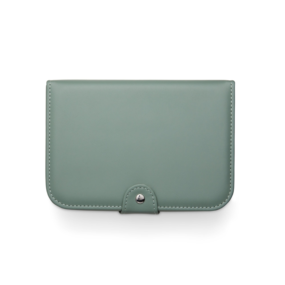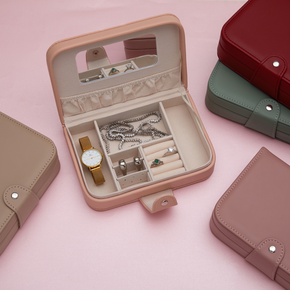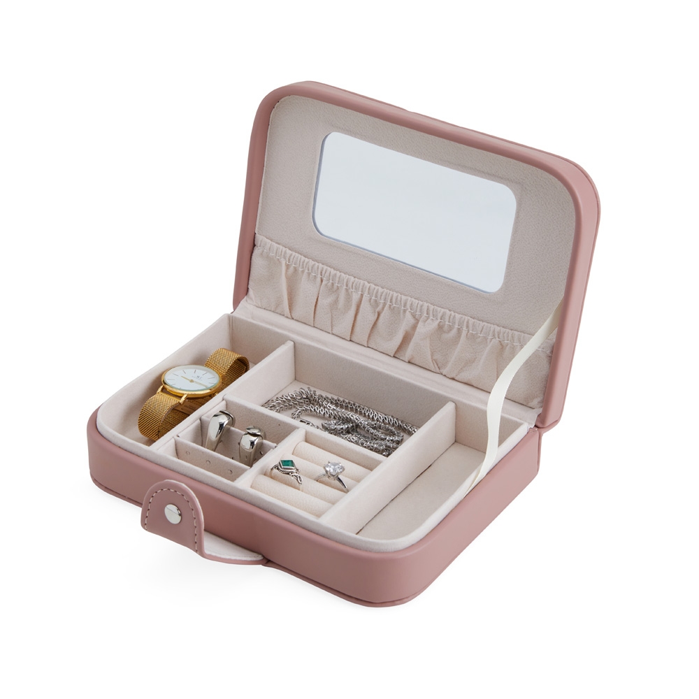 Porta joias em couro sintético com revestimento aveludado e espelho. Possui compartimentos internos para anéis, pulseiras, colares e placas para brincos.