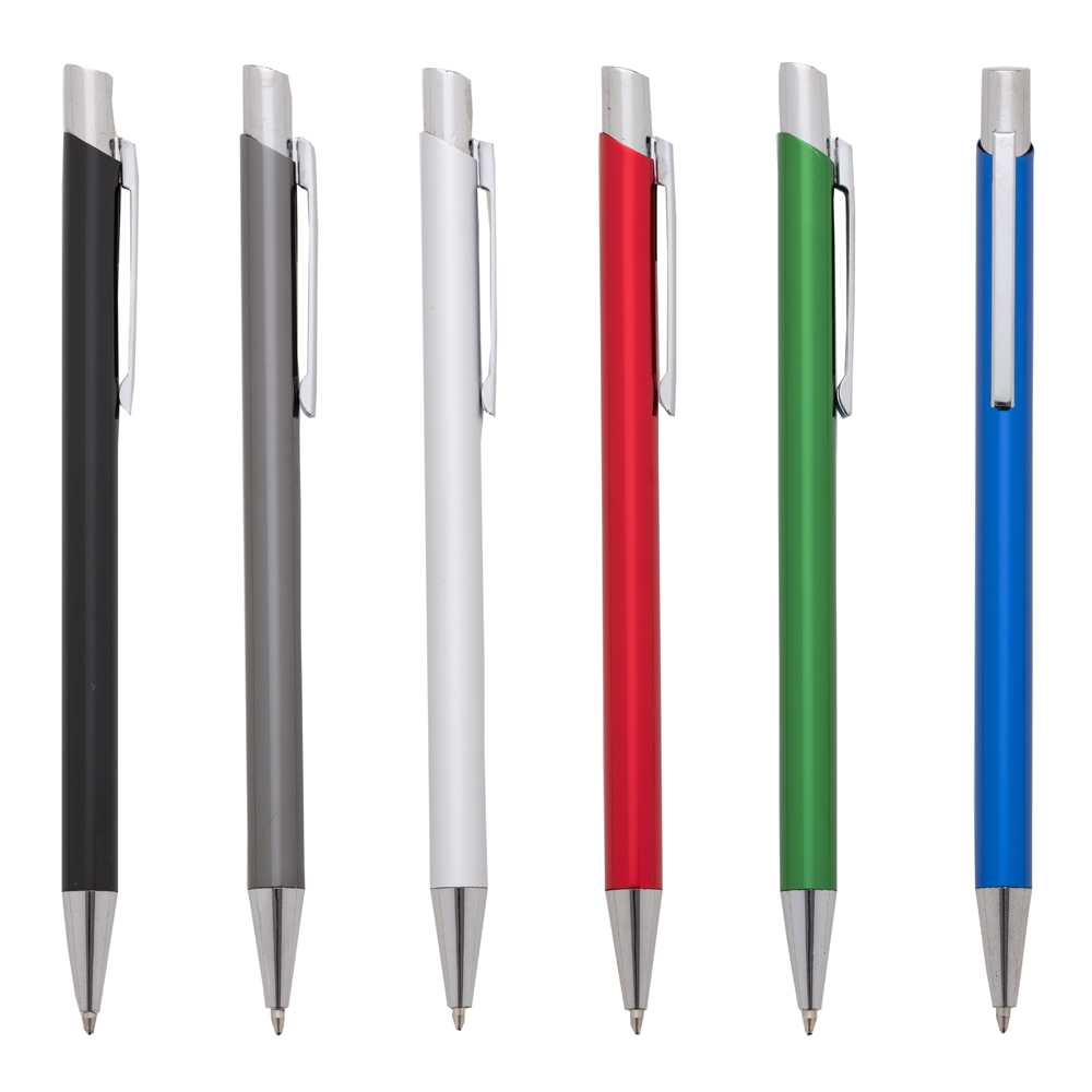 Caneta metálica com carga esferográfica azul e acionamento por clique.