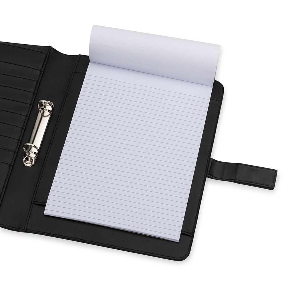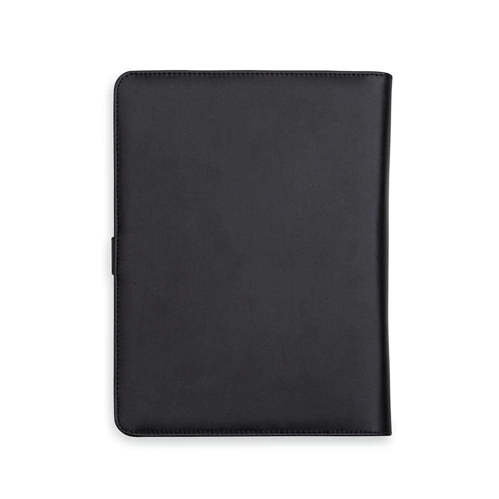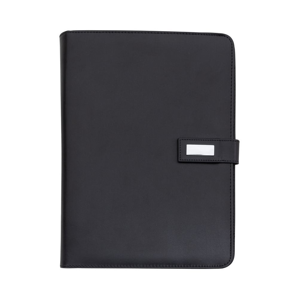 Pasta convenção com fecho imantado e plaquinha personalizável. Produzido em couro sintético, a pasta contém bolso lateral na contracapa e bolso com fechamento em zíper, além divisórias para cartões e/ou documentos com bolso lateral. Possui acesso para fichário de duas argolas e compartimento para bloco de folhas com aproximadamente 20 folhas brancas com pauta.