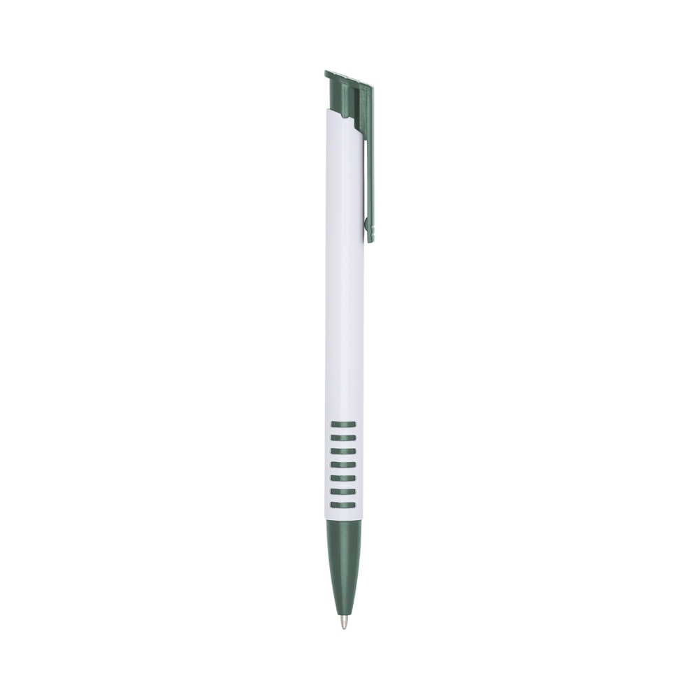 Caneta plástica com carga esferográfica azul e acionamento por clique.