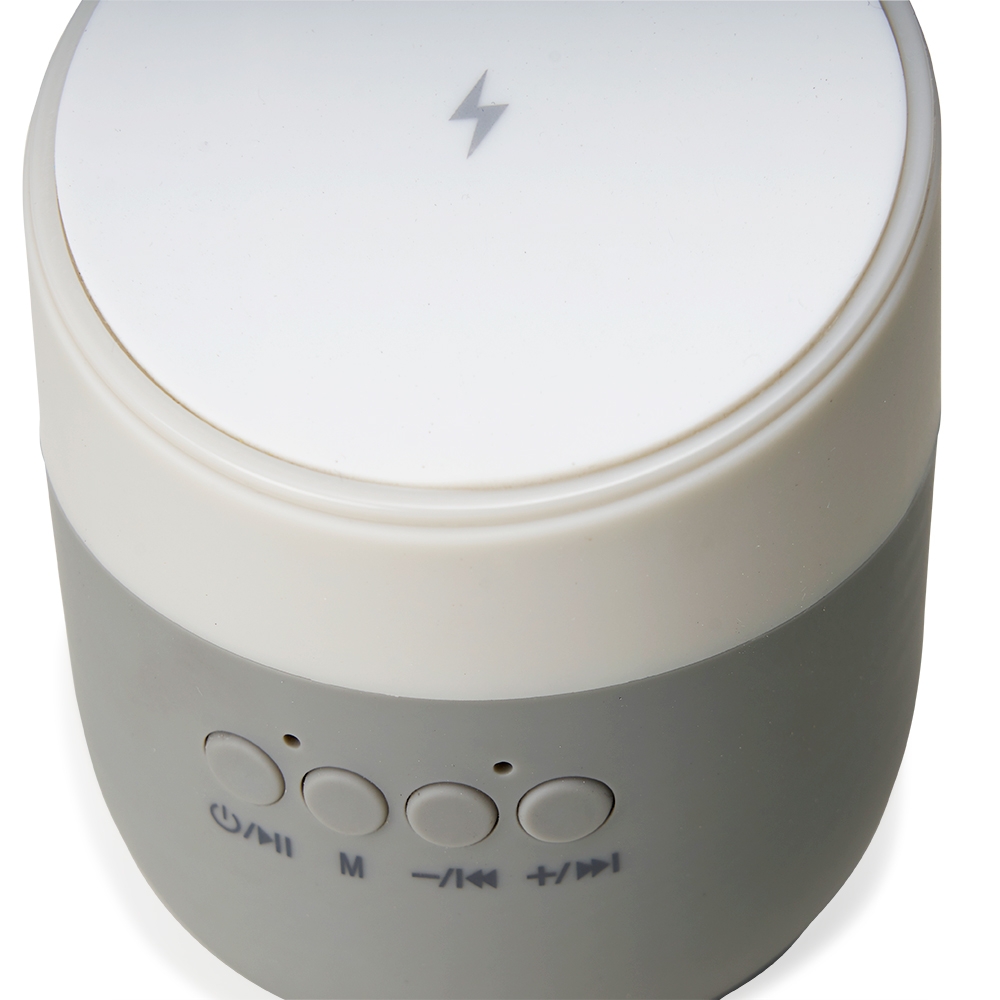 Caixinha de Som bluetooth com carregador por indução. Produzido em material plástico, a caixinha possui antiderrapantes emborrachados na parte inferior, e na área de indução. Para desfrutar do carregamento por indução (sem fio) é fundamental que o celular possua a tecnologia QI – desta maneira é possível carregar o celular posicionando-o sob carregador, sendo necessário apenas conectar o carregador à uma fonte de energia (USB ou diretamente na tomada). A caixinha executa nos modos bluetooth e cartão TF (microSD) Acompanha cabo USB.