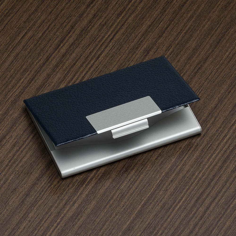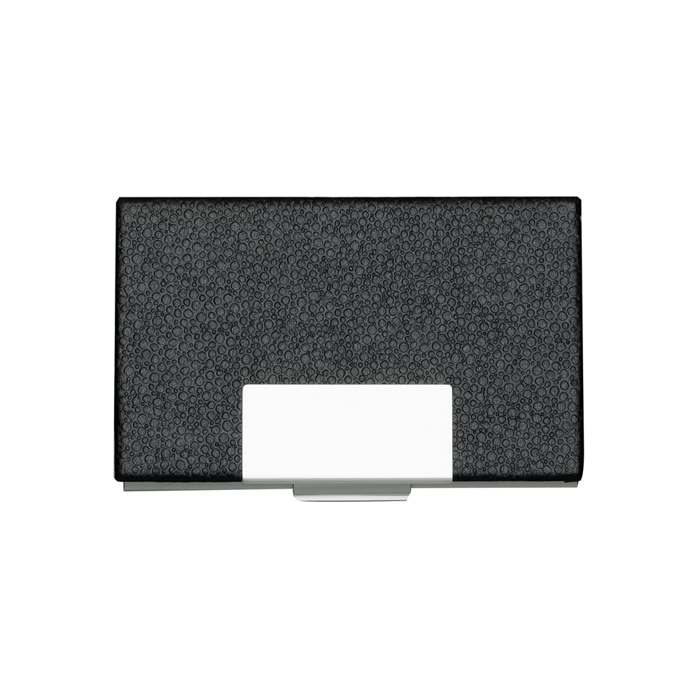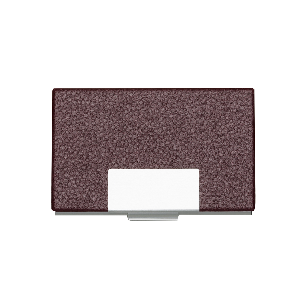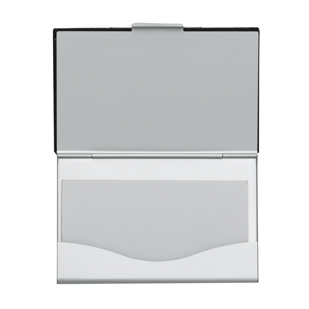 Porta cartão em couro sintético com detalhes em prata. Possui chapa central em metal para gravação, parte interna e traseira em alumínio.