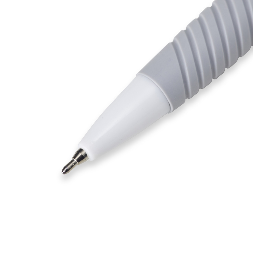 Caneta plástica com detalhe emborrachado e acionamento por clique, carga esferográfica azul 0.8mm.