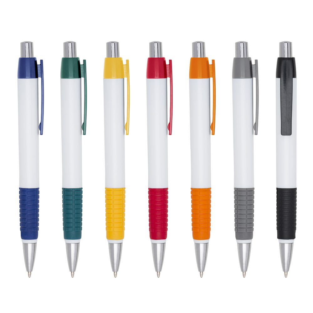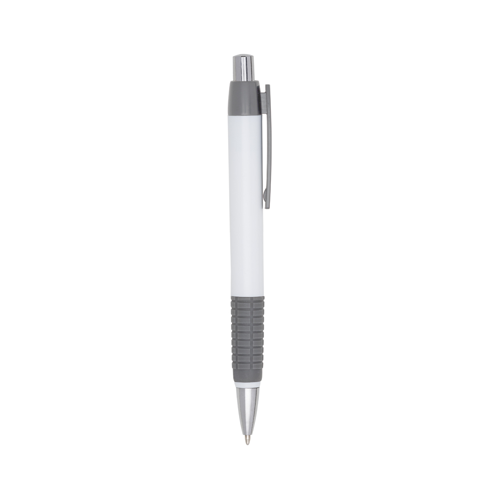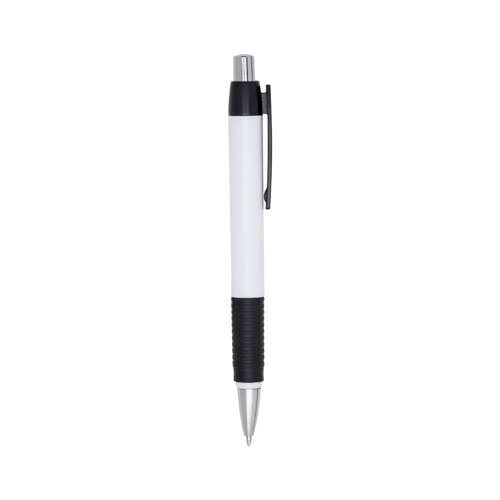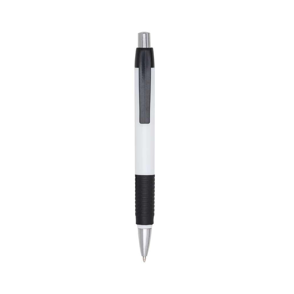 Caneta plástica com detalhe emborrachado, carga esferográfica azul e acionamento por clique.