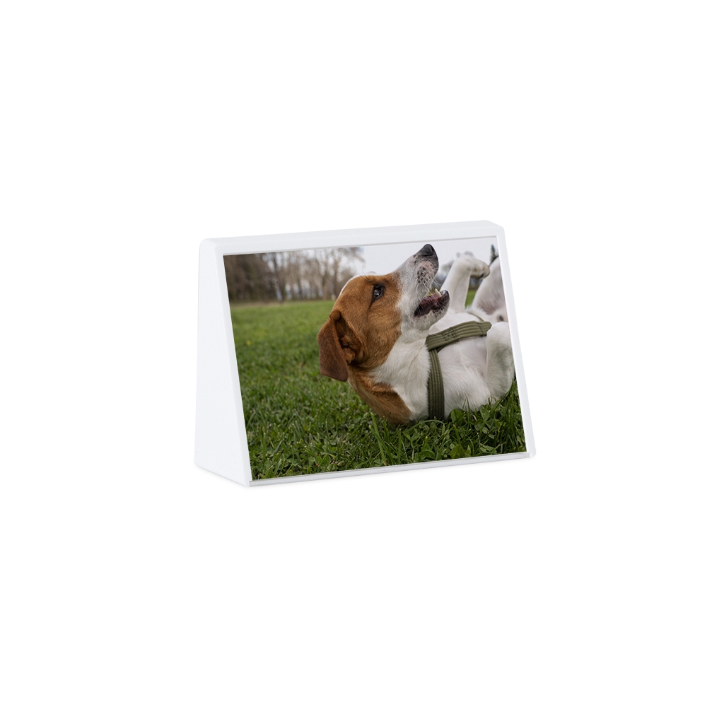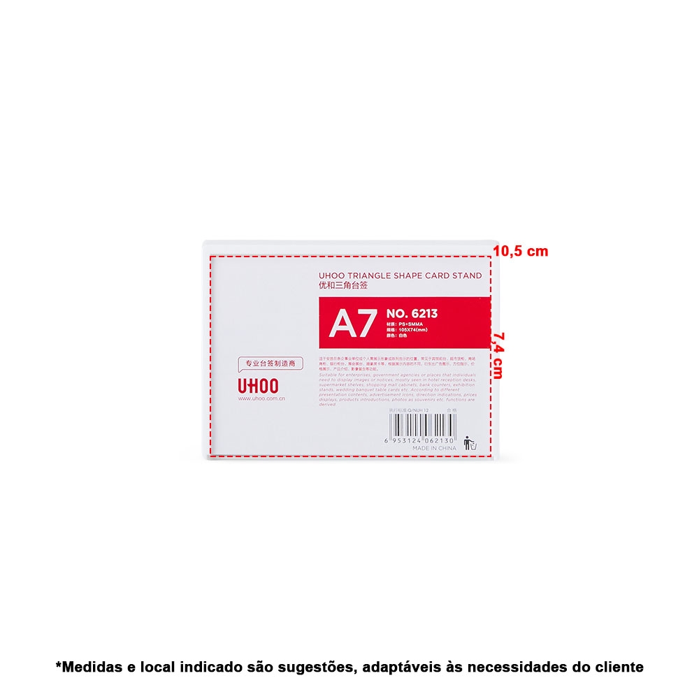 Expositor porta retrato A7 feito em poliestireno com placa acrílica.