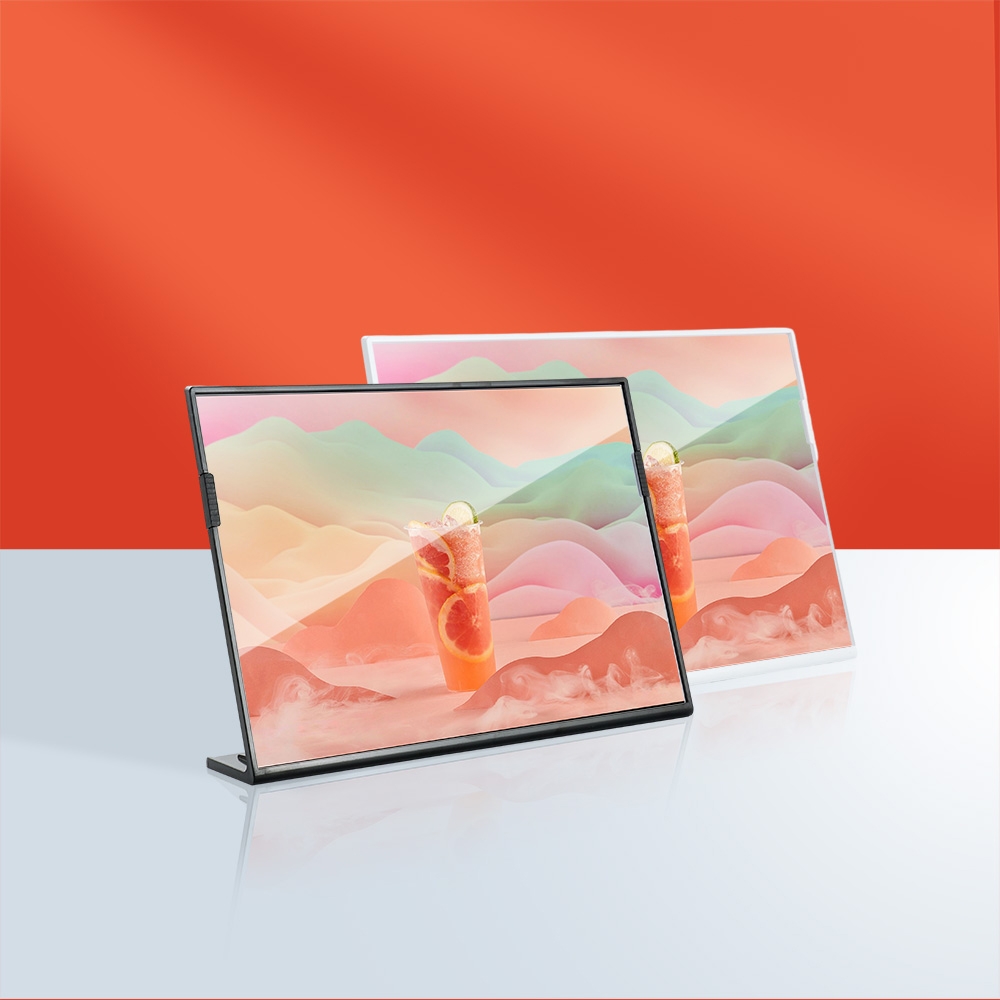 Expositor porta retrato A4 feito em poliestireno com placa acrílica.