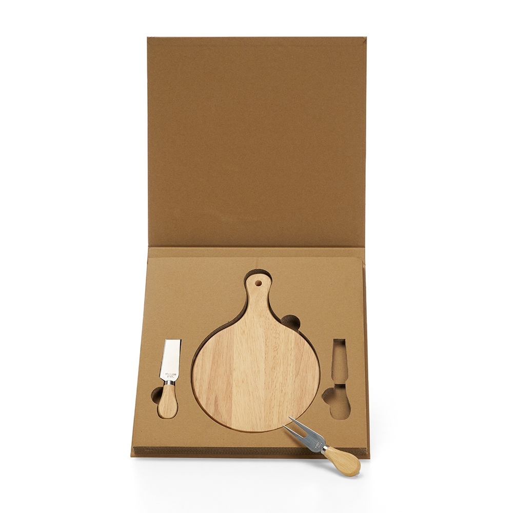 Kit queijo 3 peças em estojo kraft, contém: Tábua de bambu redonda, faca reta, e garfo. Tábua com orifício para encaixe.
