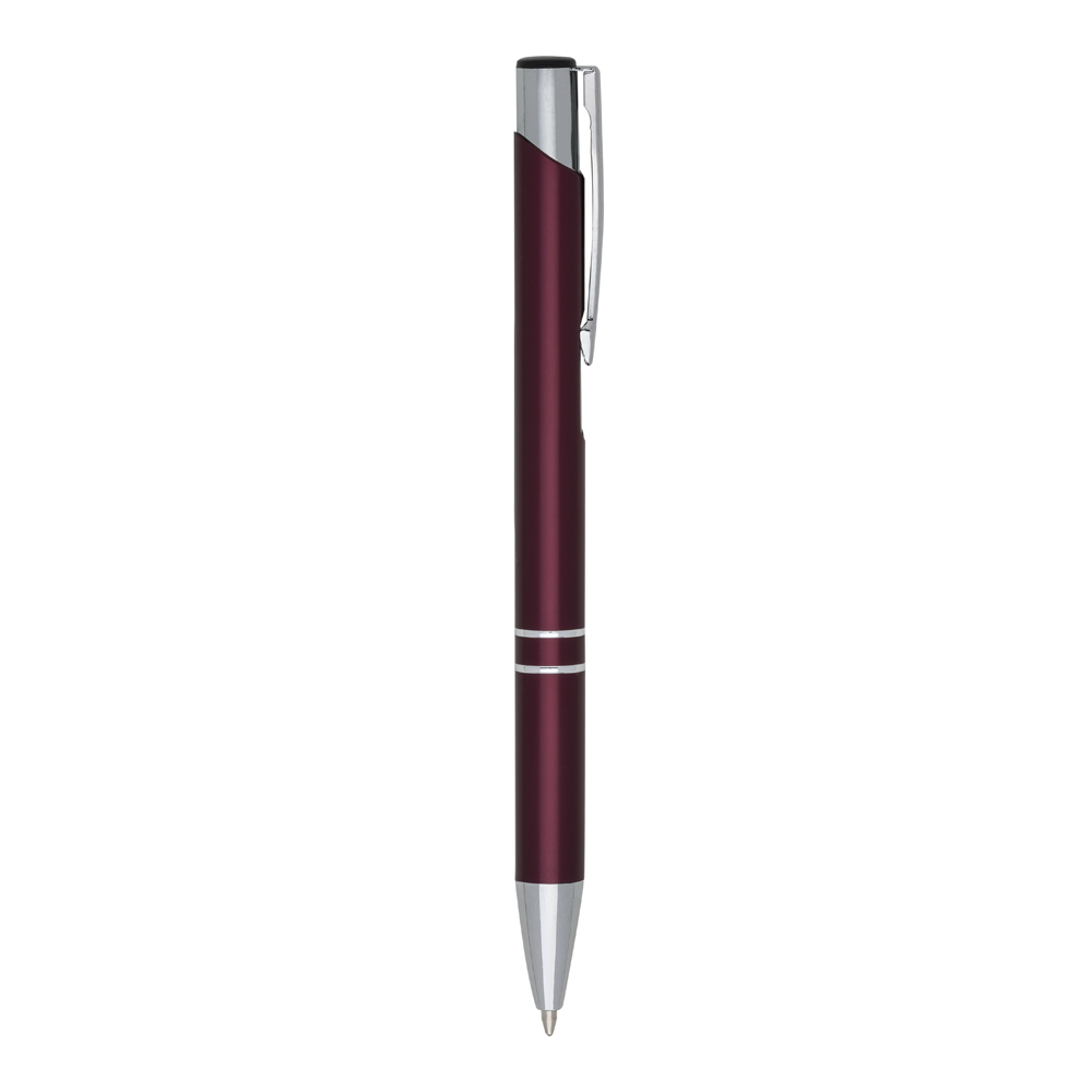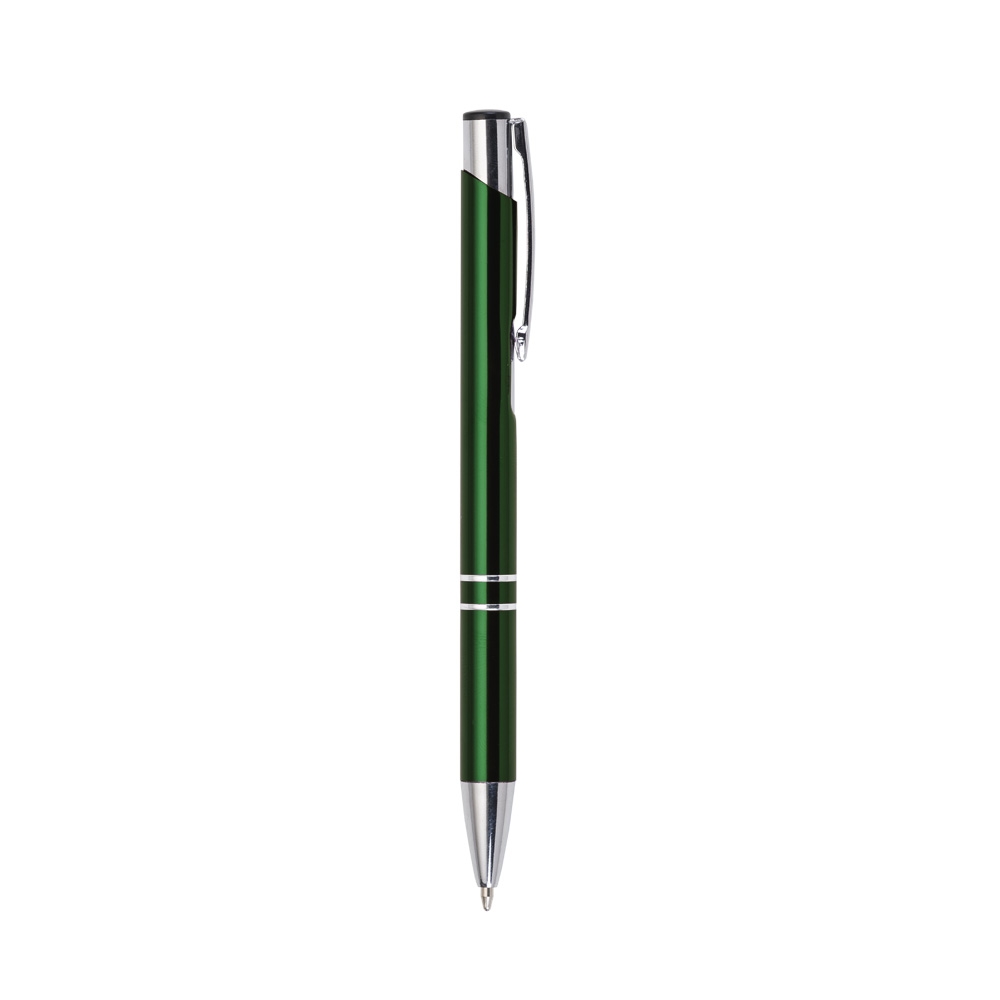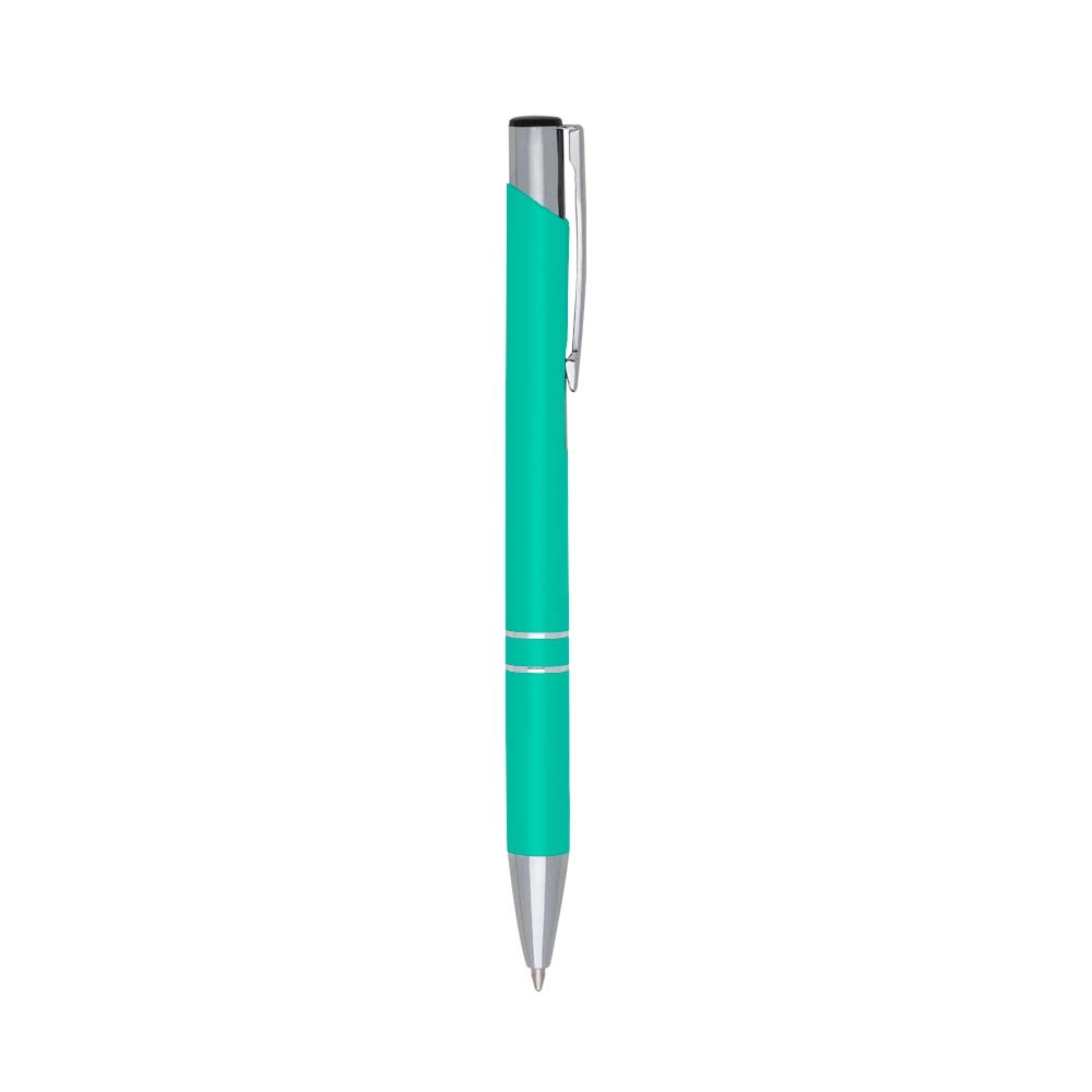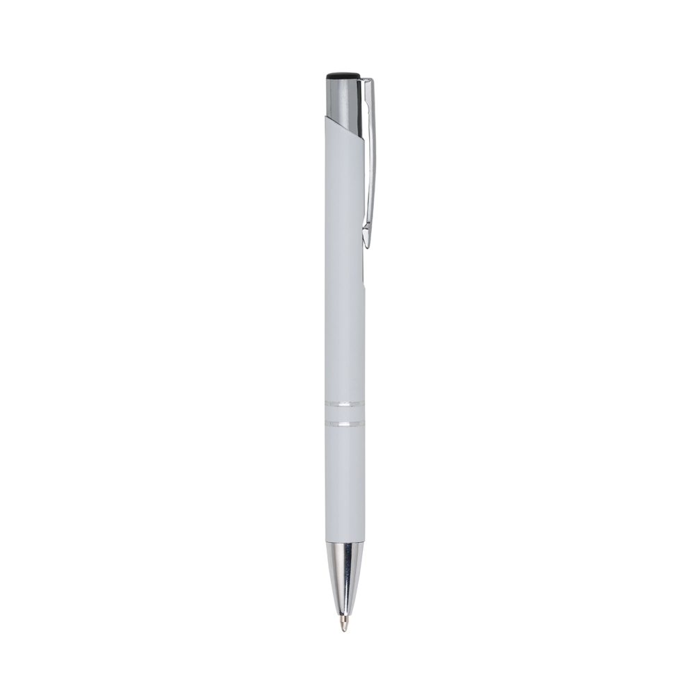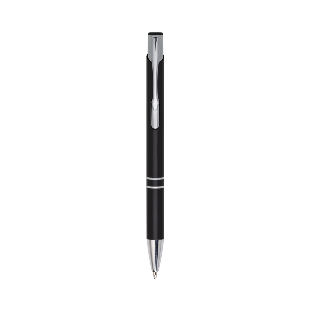 Caneta metálica com carga esferográfica azul e acionamento por clique.