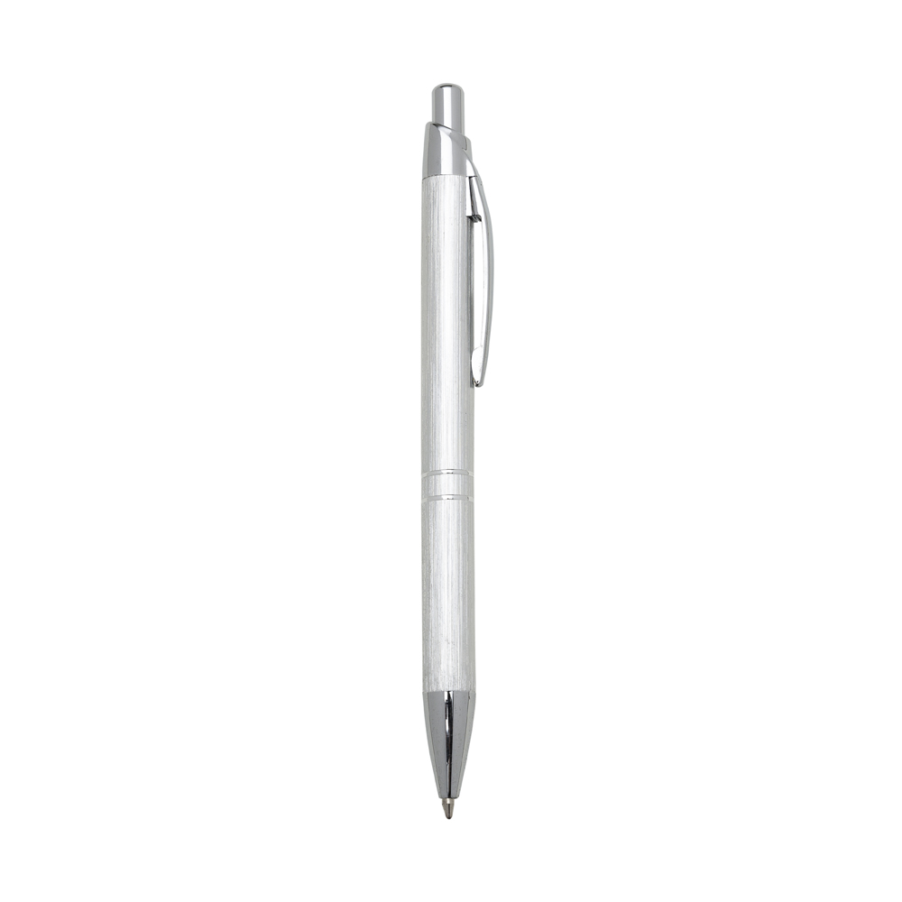 Caneta metálica com carga esferográfica azul e acionamento por clique.