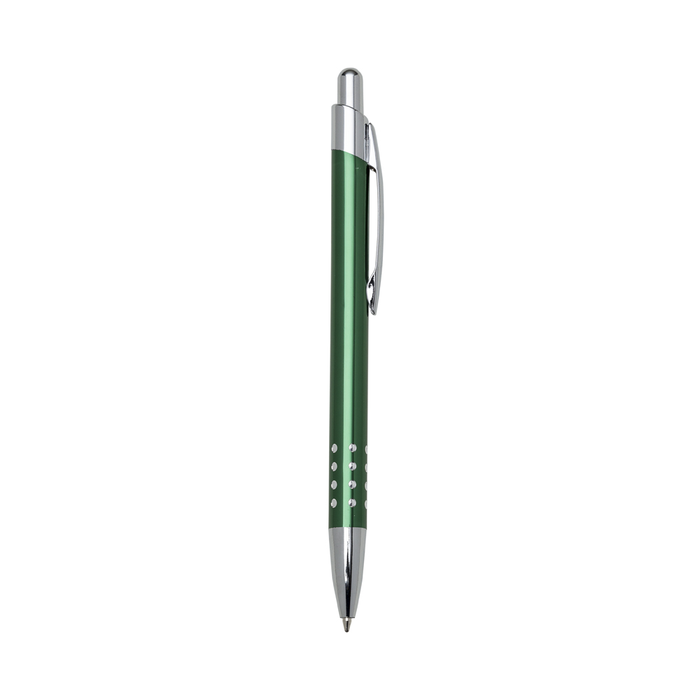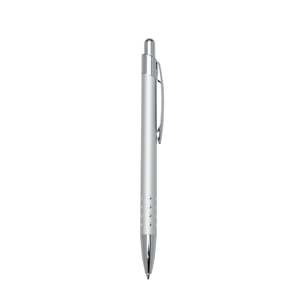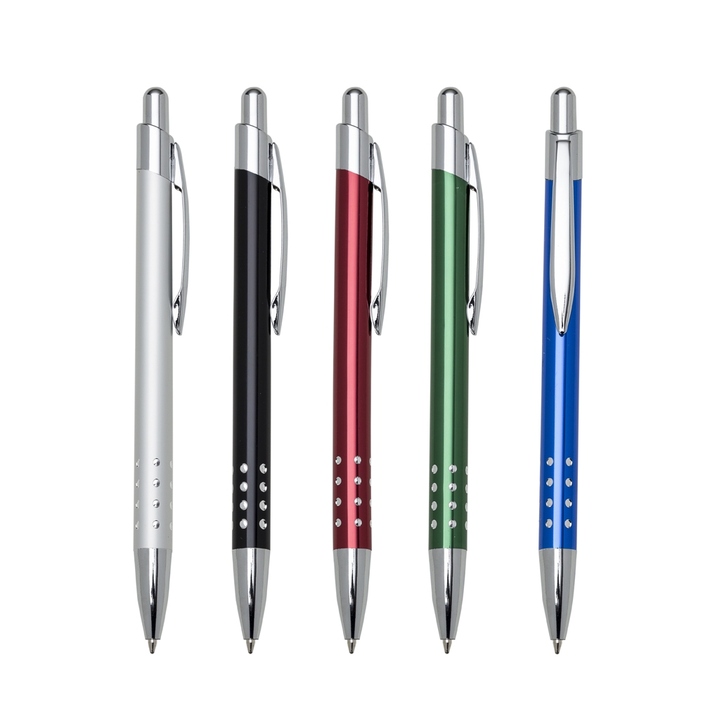 Caneta metálica com detalhes em cristal, carga esferográfica azul e acionamento por clique.