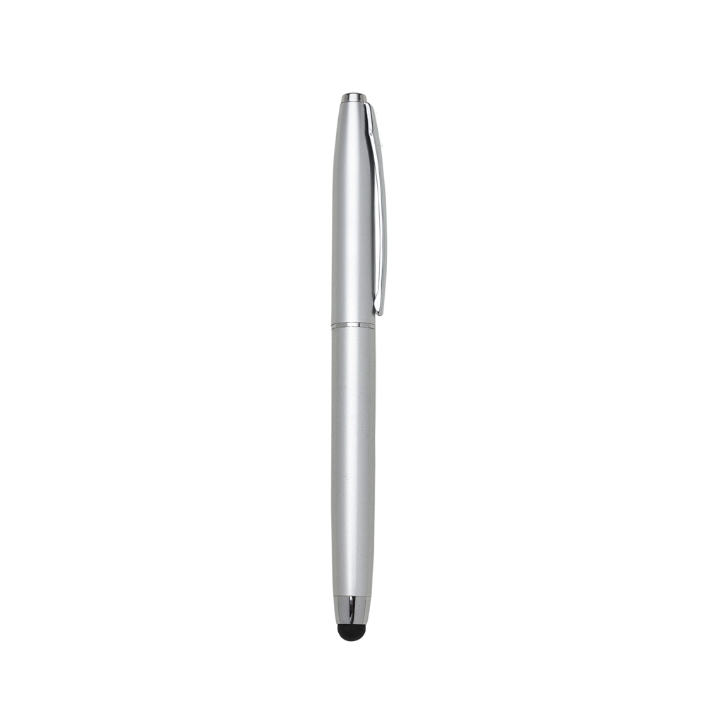Caneta plástica com tampa e touch screen, carga esferográfica azul.