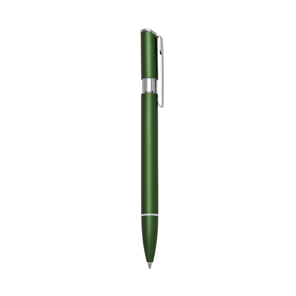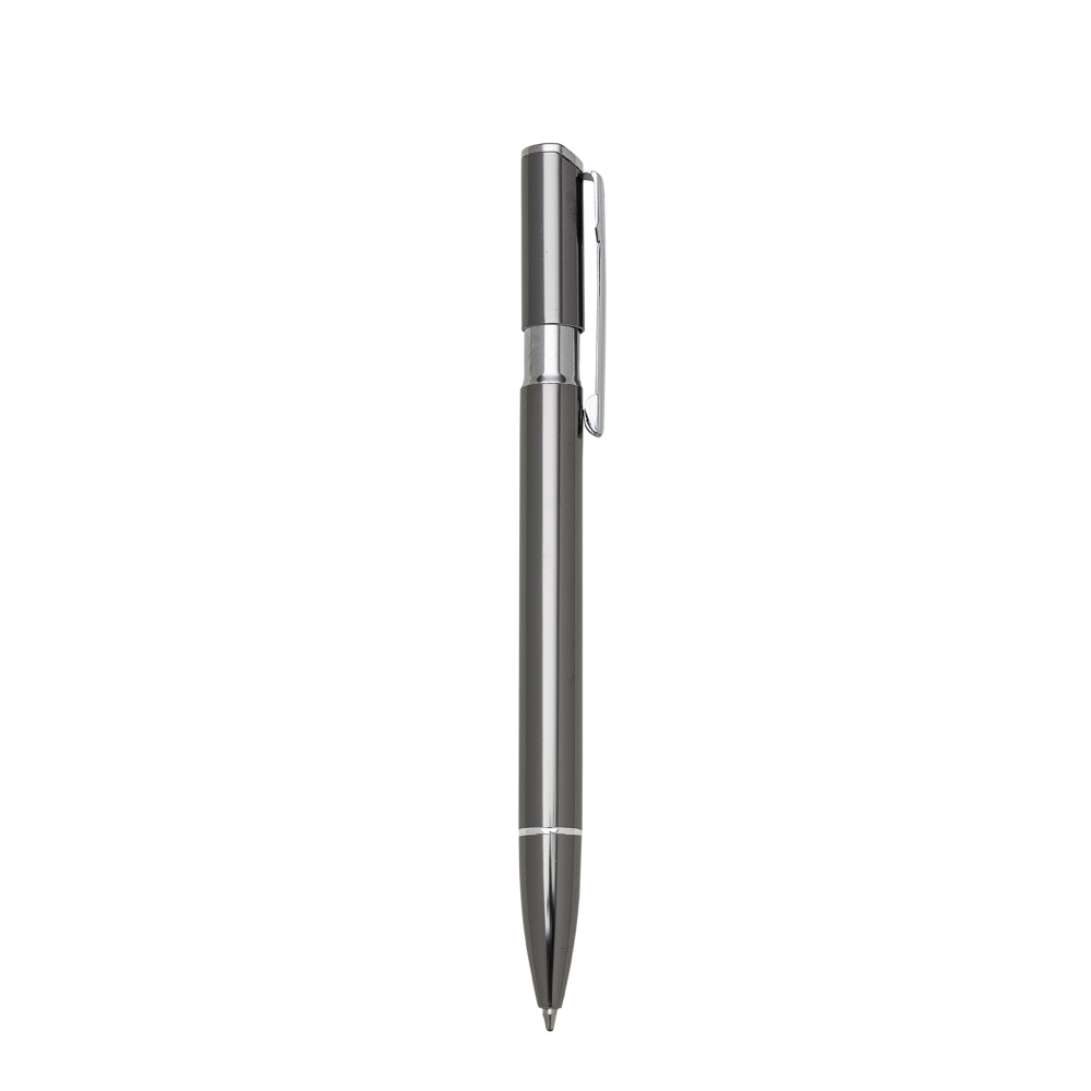 Caneta alumínio, carga esferográfica azul e acionamento por clique.