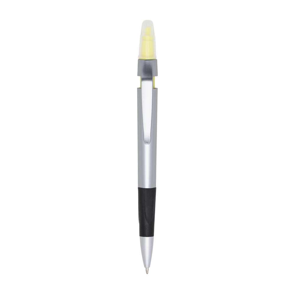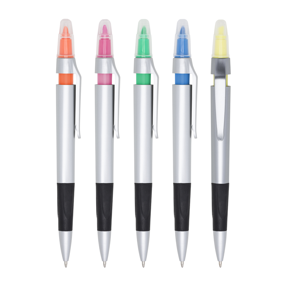 Caneta plástica com marca texto, contém detalhe emborrachado e tampa protetora para o marca texto. Carga esferográfica azul e acionamento por clique.