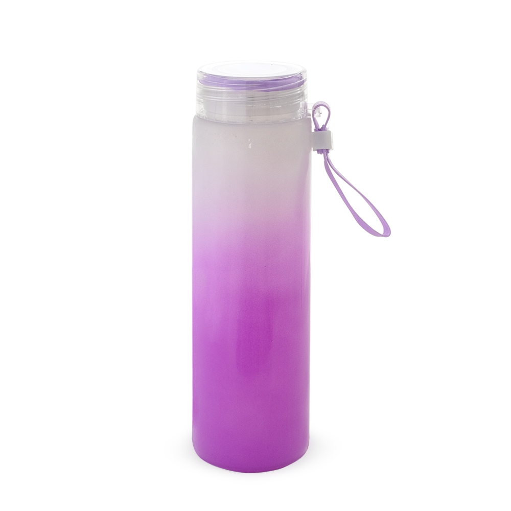 Garrafa de vidro bicolor 400ml com alça de silicone. OBS.: PODEM HAVER RISCOS NA PINTURA E/OU PEQUENAS BOLHAS NO CORPO DA GARRAFA.