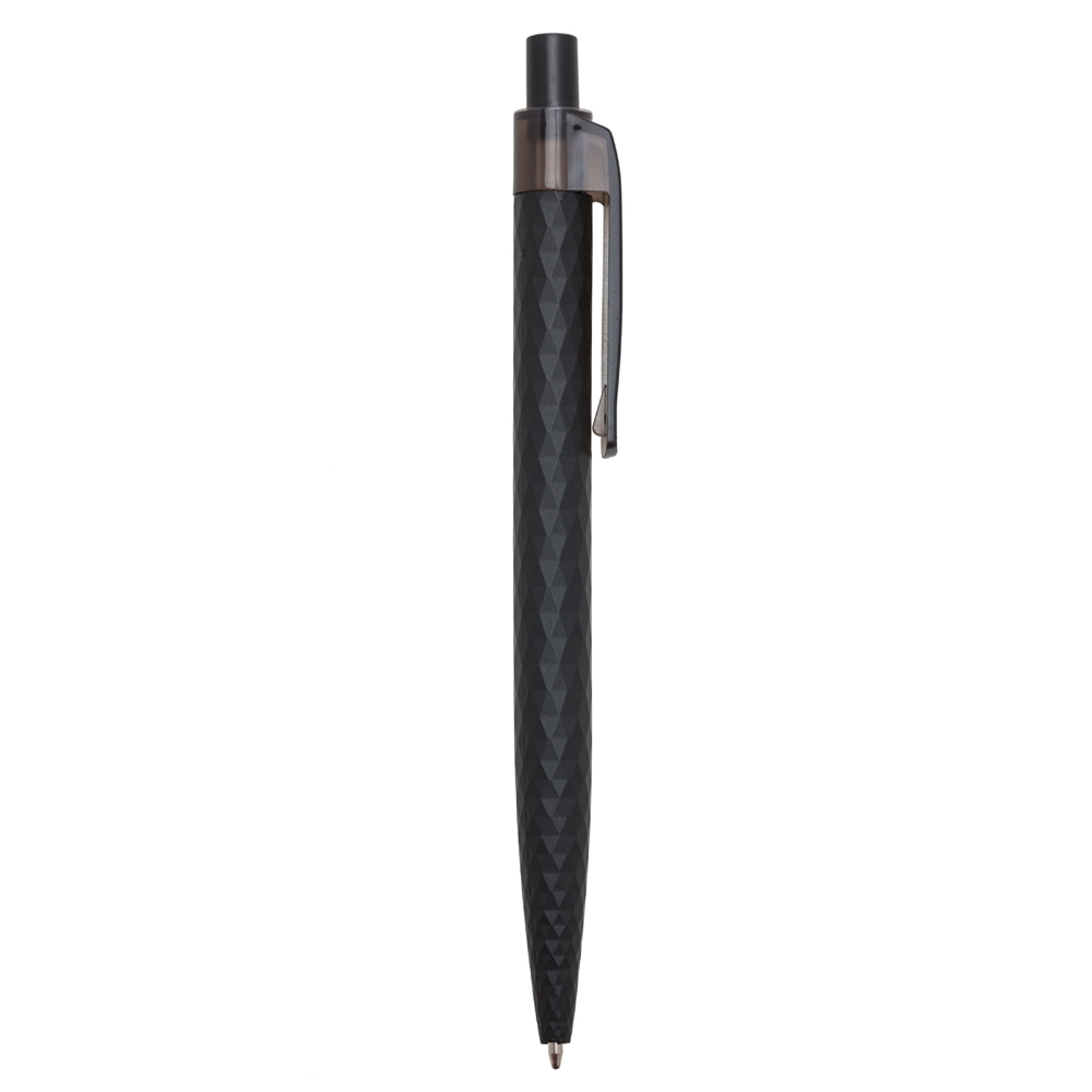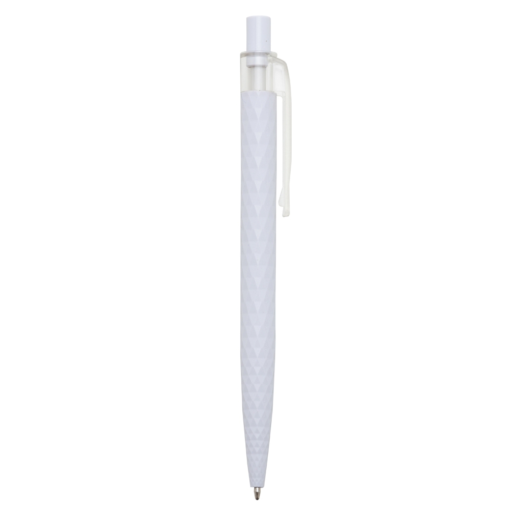 Caneta plástica com design texturizado carga esferográfica azul e acionamento por clique.