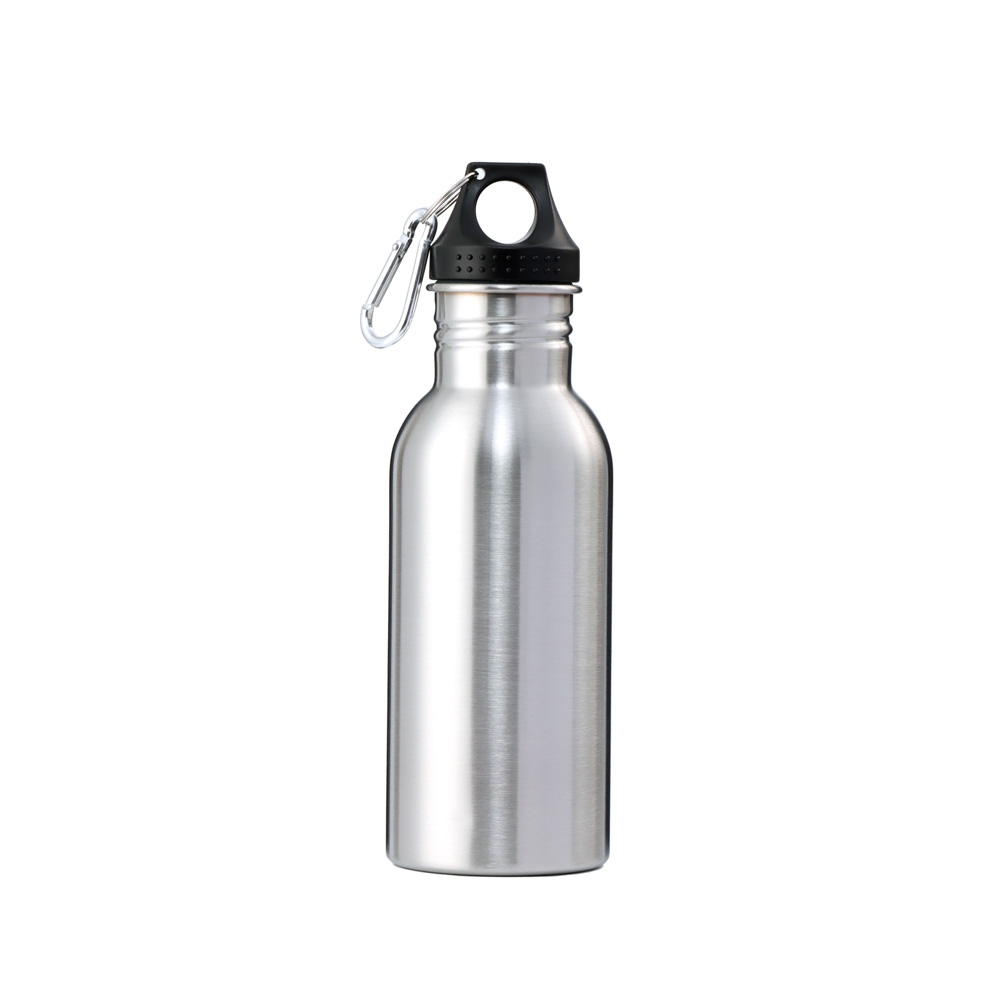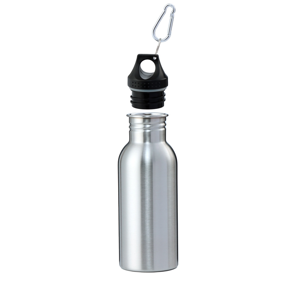 Garrafa de inox com capacidade de 640ml, contém tampa plástica rosqueável e acompanha chaveiro mosquetão.