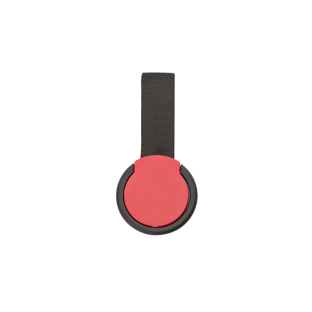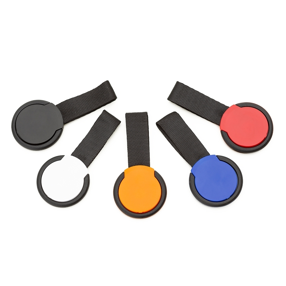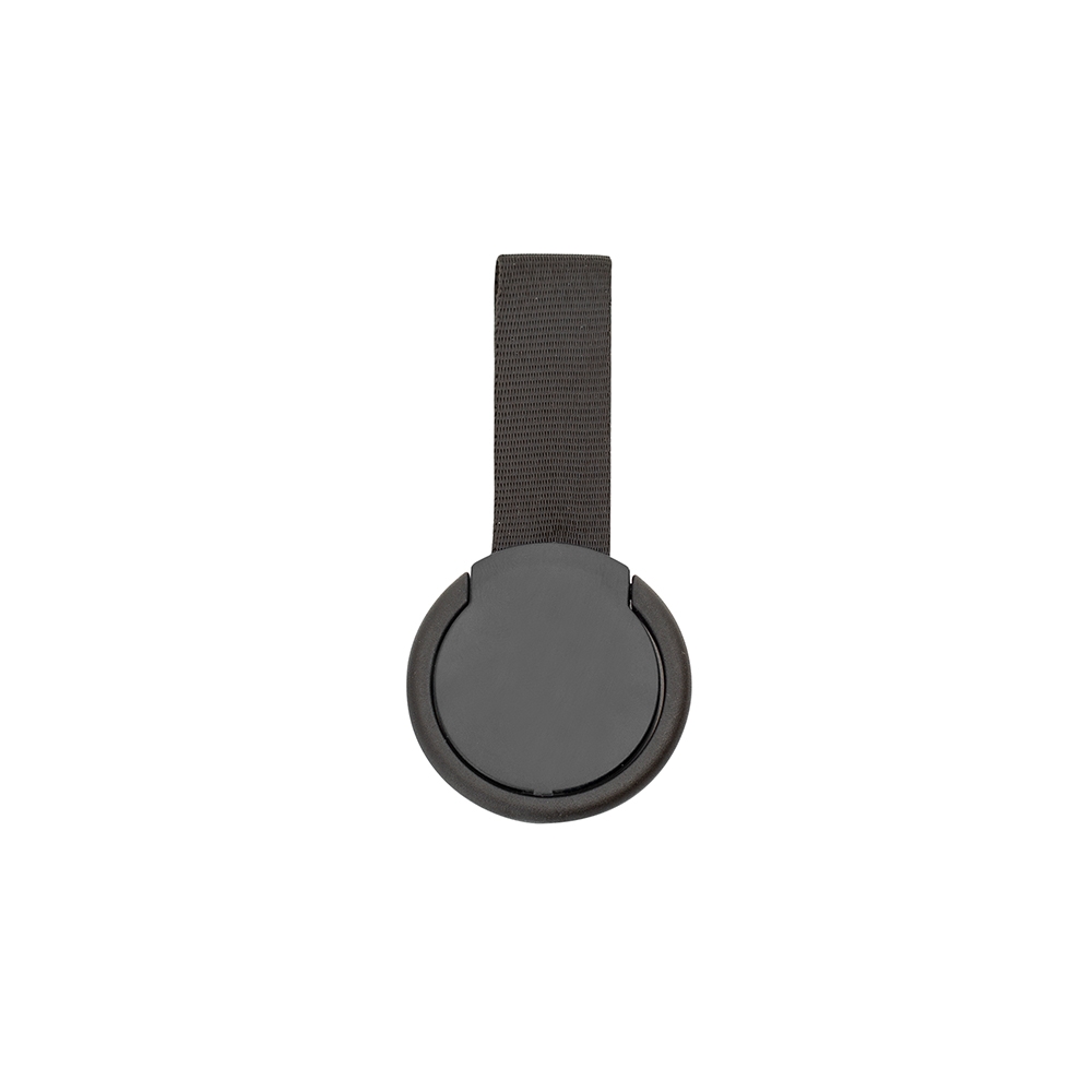 Suporte anti-furto para celular, material plástico com alça de nylon (não removível) e verso adesivado (3M).